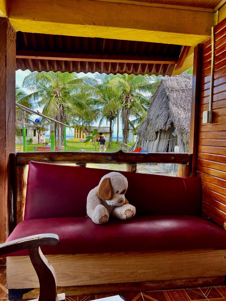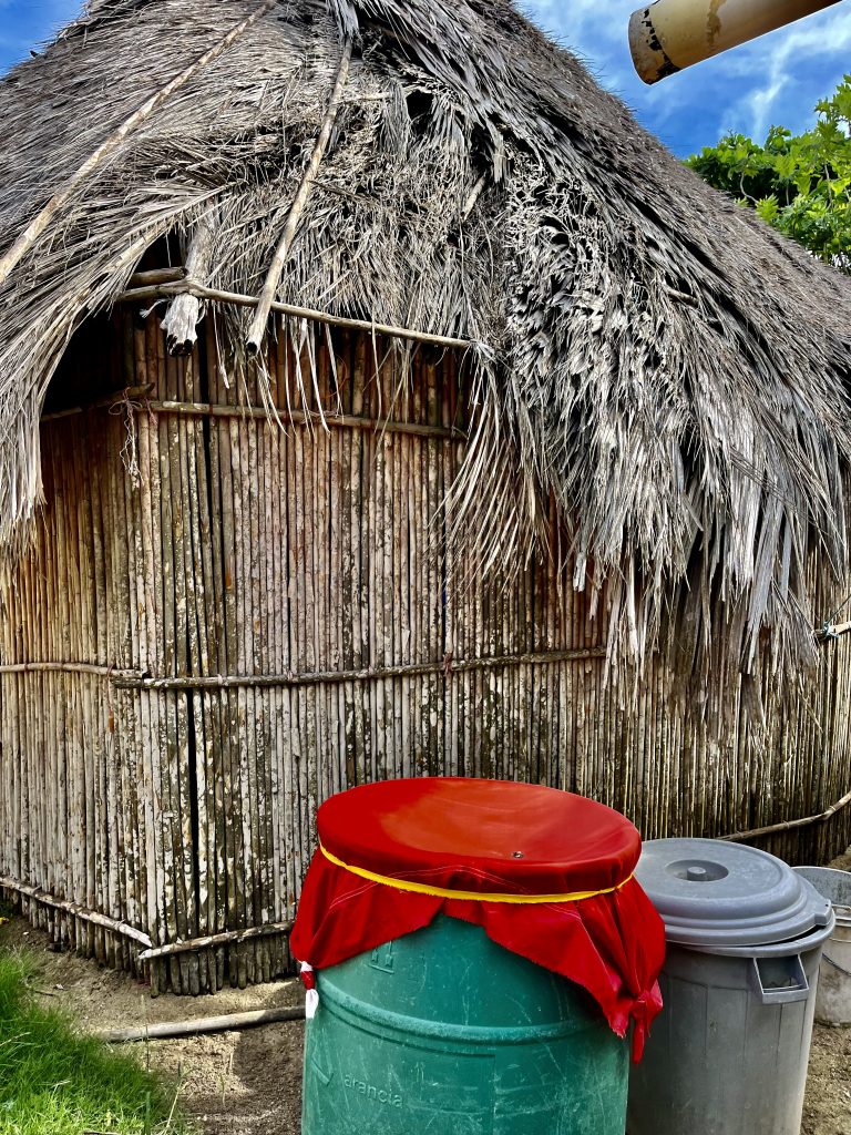 Dieses Haus ist das Versammlungshaus, noch etwas traditioneller mit Palmenblättern eingedeckt. Jeden Tag kommen hier die Männer des Dorfes zusammen, um Probleme und andere Dinge zu besprechen. Oha. Ich dachte die leben hier in einem Matriarchat? Ja, tun sie auch. Aber das bedeutet nur, dass die Männer nach der Hochzeit im Familienclan der Frau leben, nicht dass die Frauen auch herrschen. Wieder was gelernt. Ich möchte wissen, was sie mit Problemfällen machen? Was ist, wenn jemand kriminell wird, also echte Probleme bereitet? Dann rufen sie die Polizei aus Panama und lassen den Übeltäter nach Colón bringen. Sieh an! Das hätte ich nun wieder nicht gedacht!!