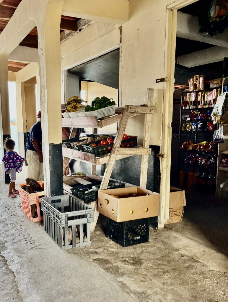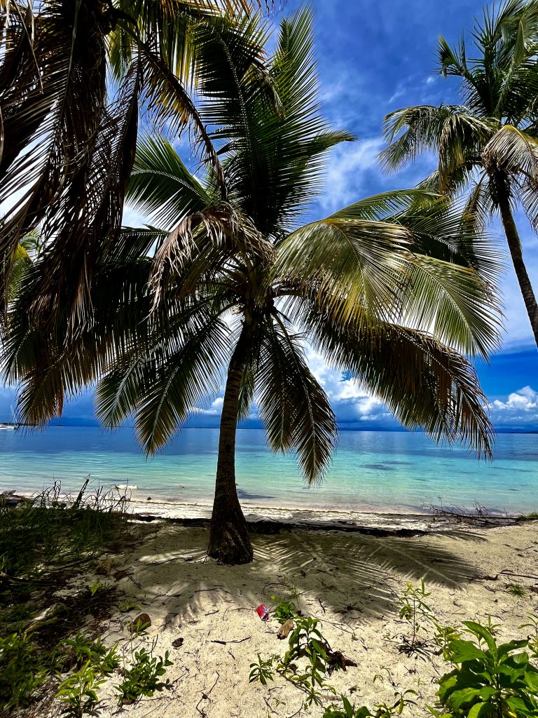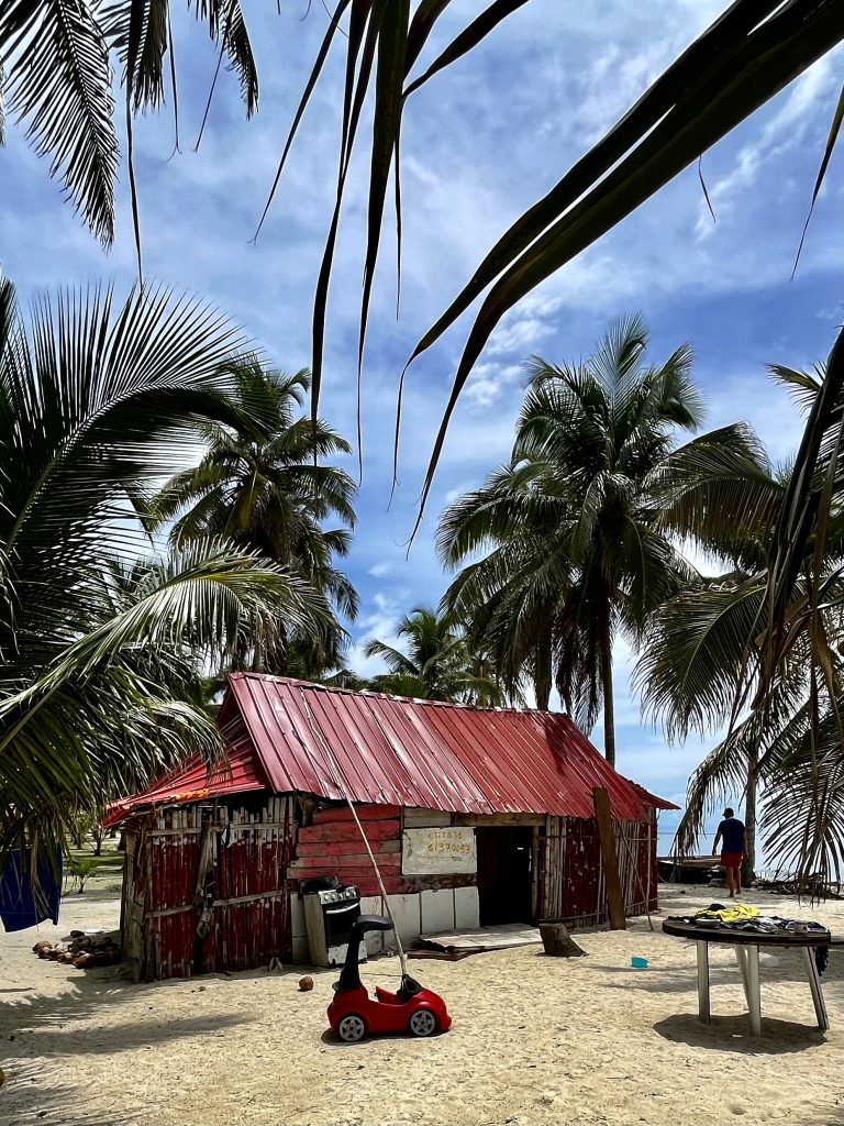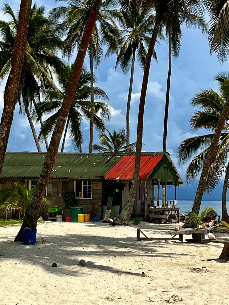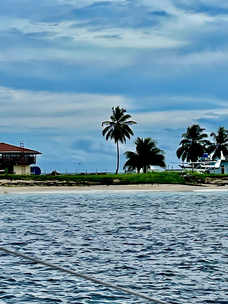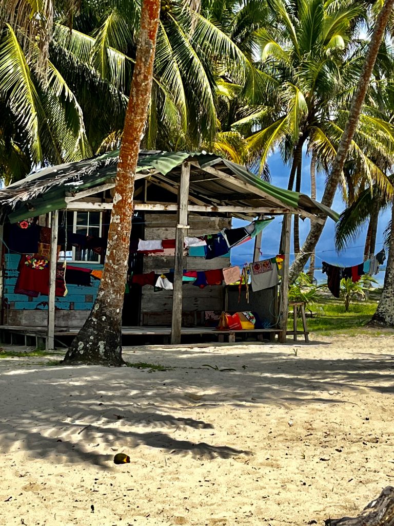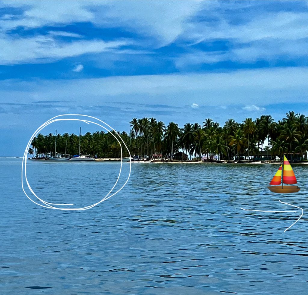 Er hat schon eingekauft, jetzt kaufe ich, Bananen, Zwiebeln, Tomaten und Gurken. That‘s it. Kurzer Small Talk mit Rotzis Freunden, dann geht’s zurück zum Dinghy. Er zeigt uns noch die Schule, den Volleyball-Platz und die Krankenstation, auf der es ausschließlich „Panamamedizin“ gibt. Lustig, so nennt er die westliche Chemiemedizin 💊, denn sie haben parallel dazu noch ihre eigene, traditionelle Medizin 🌱🍄☘️🪸… Am Dinghy angekommen, geht’s wieder zurück zu El Porvenir, um ihn dort abzusetzen. Er bekommt ein 10 $ Dankeschön-Trinkgeld und wir tuckern zurück zu Yuti. Anker lichten und ab zu den Chichime-Cays. Unterwegs kommen wir an anderen kleinen Inseln vorbei. Alle sind klein, kleiner am kleinsten und sehr flach. Bei Flut, und die ist hier nur 30 cm, ist der Strand drumherum weg.