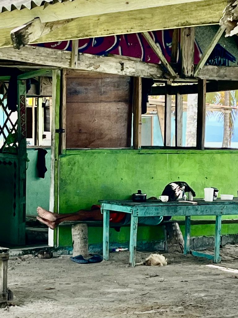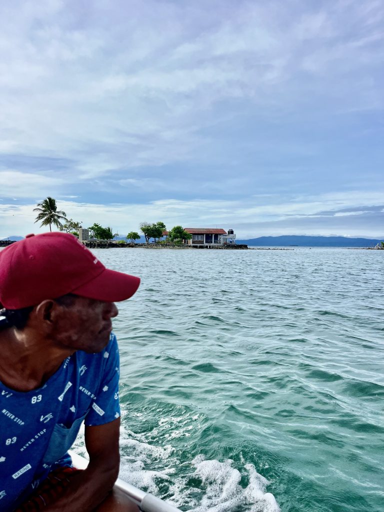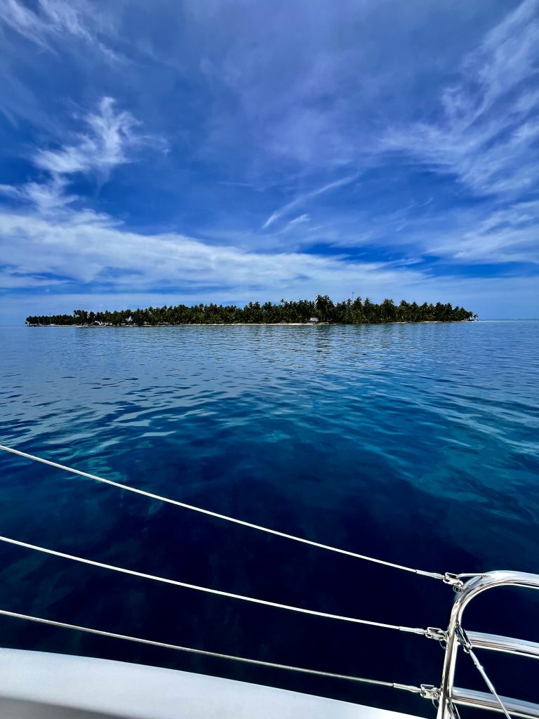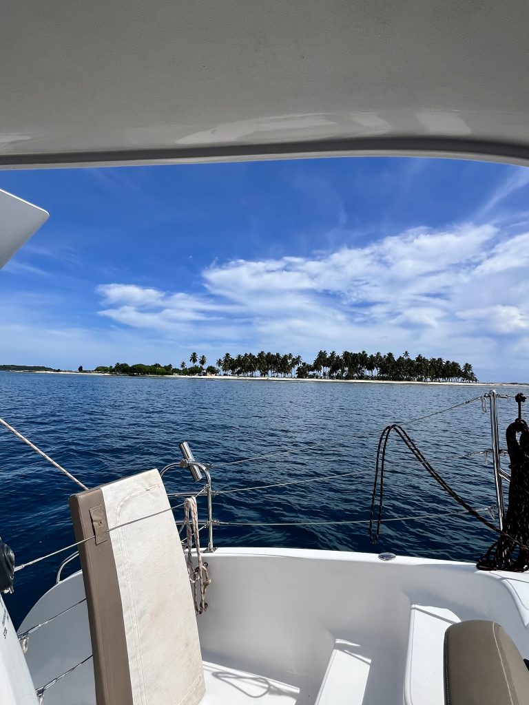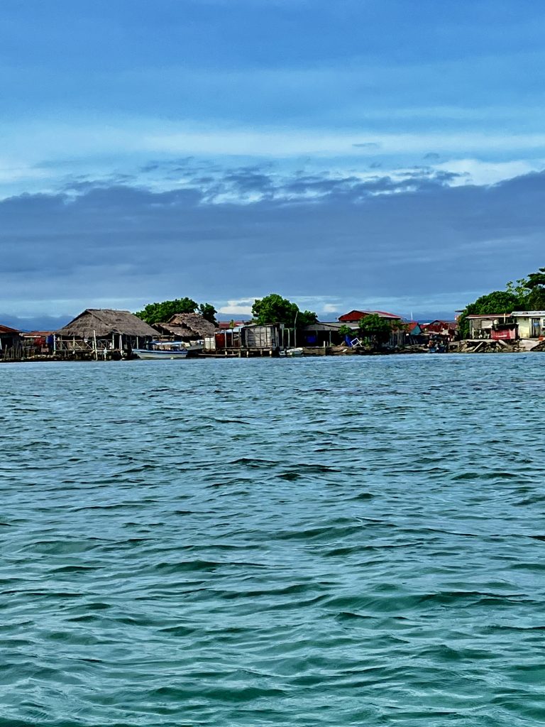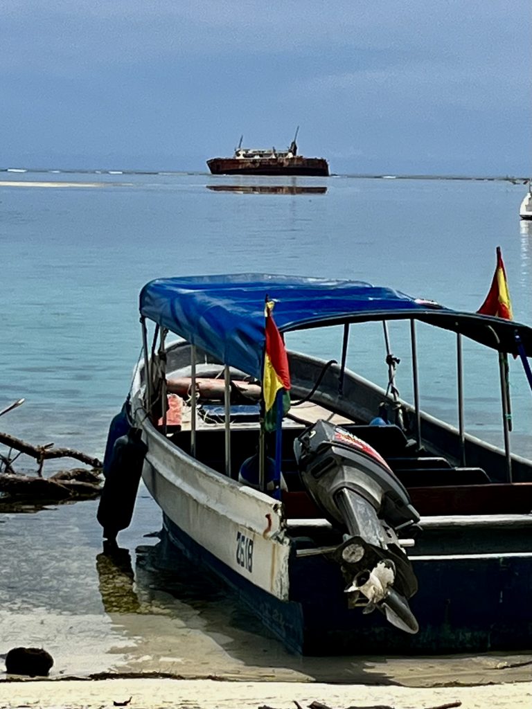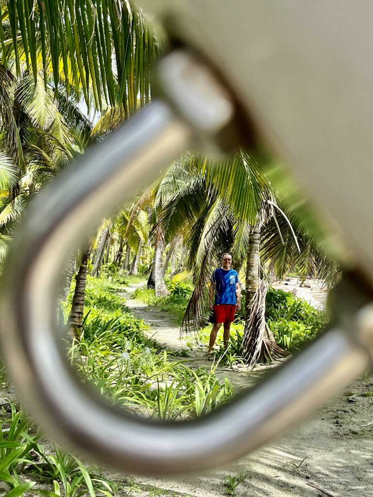 Er hat schon eingekauft, jetzt kaufe ich, Bananen, Zwiebeln, Tomaten und Gurken. That‘s it. Kurzer Small Talk mit Rotzis Freunden, dann geht’s zurück zum Dinghy. Er zeigt uns noch die Schule, den Volleyball-Platz und die Krankenstation, auf der es ausschließlich „Panamamedizin“ gibt. Lustig, so nennt er die westliche Chemiemedizin 💊, denn sie haben parallel dazu noch ihre eigene, traditionelle Medizin 🌱🍄☘️🪸… Am Dinghy angekommen, geht’s wieder zurück zu El Porvenir, um ihn dort abzusetzen. Er bekommt ein 10 $ Dankeschön-Trinkgeld und wir tuckern zurück zu Yuti. Anker lichten und ab zu den Chichime-Cays. Unterwegs kommen wir an anderen kleinen Inseln vorbei. Alle sind klein, kleiner am kleinsten und sehr flach. Bei Flut, und die ist hier nur 30 cm, ist der Strand drumherum weg.