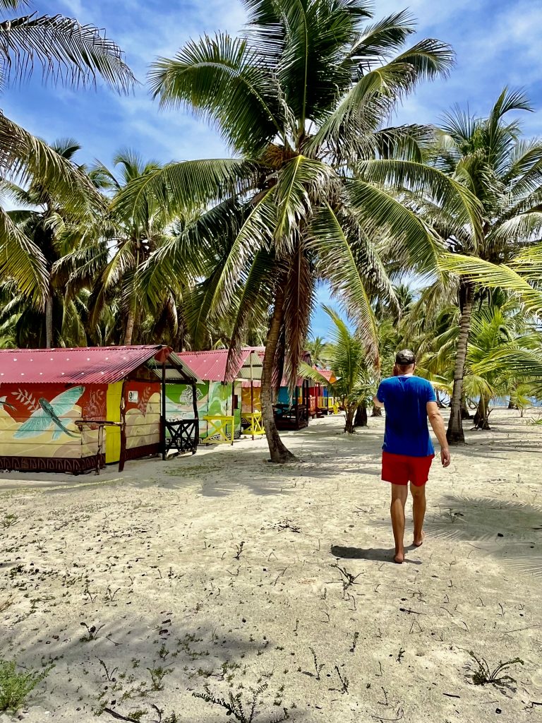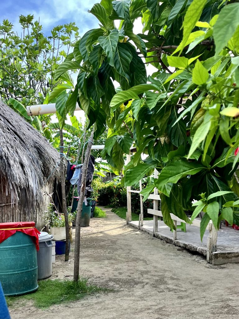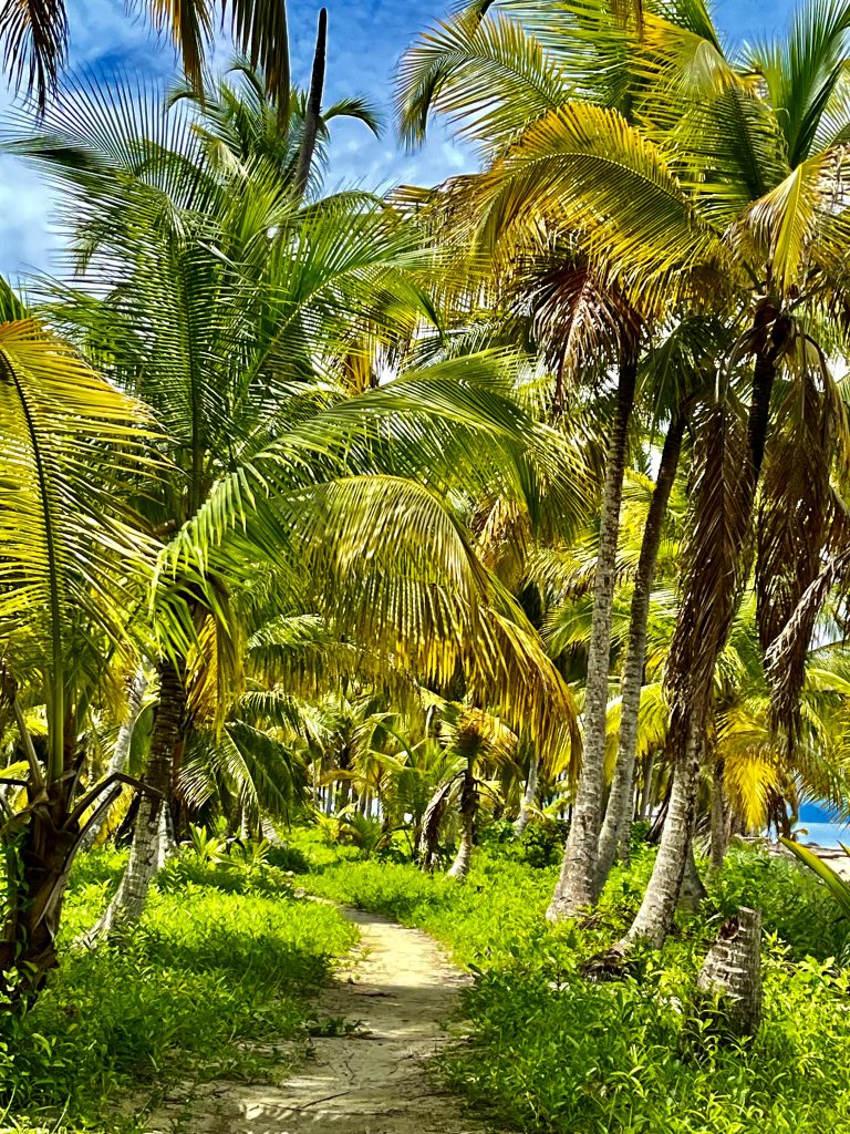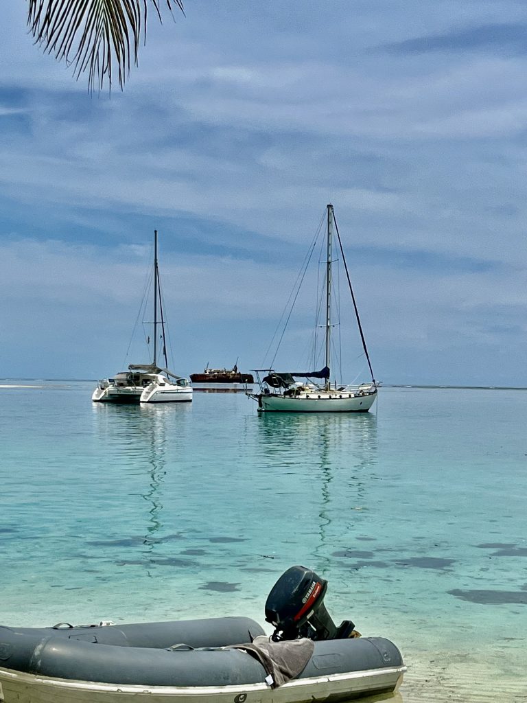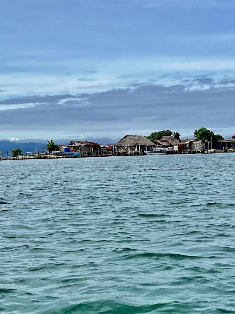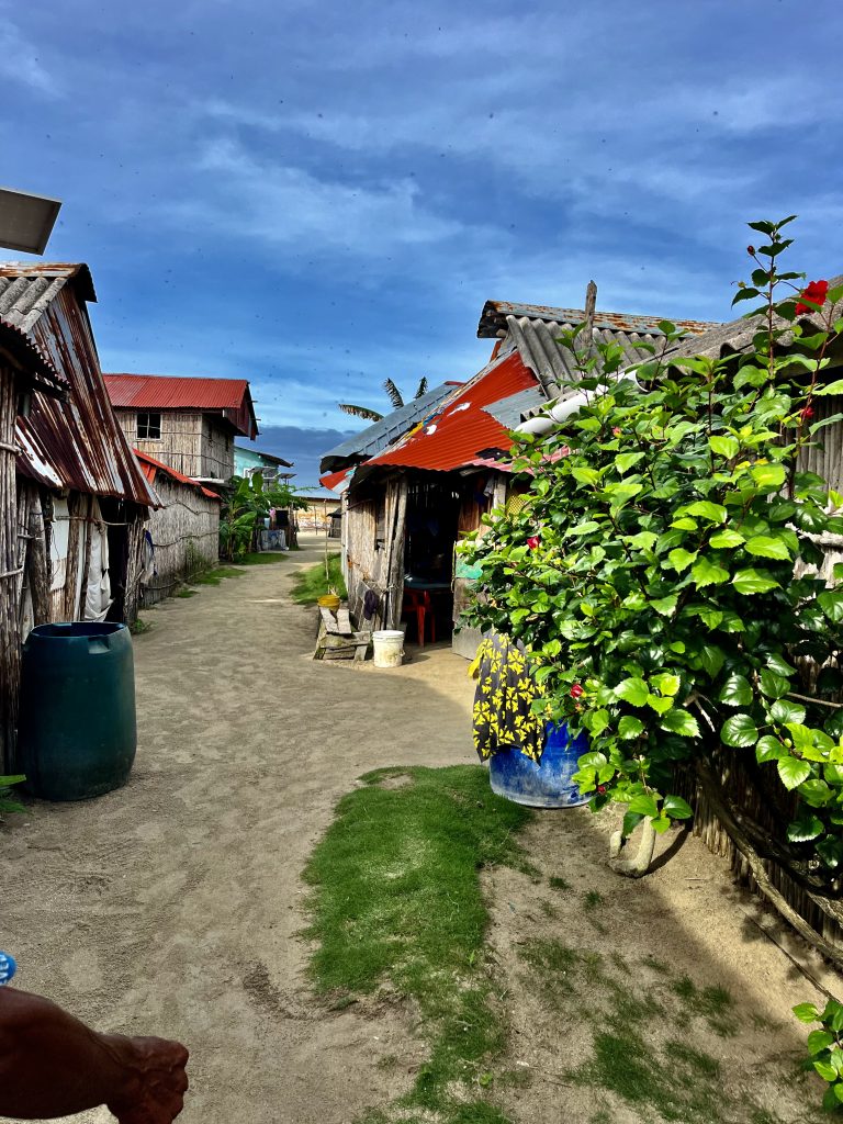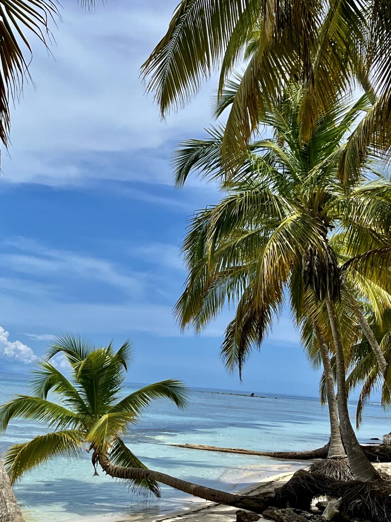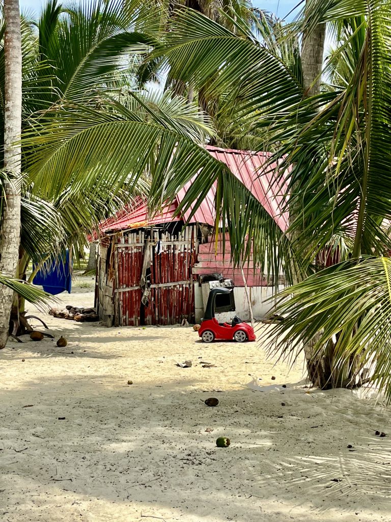 Er hat schon eingekauft, jetzt kaufe ich, Bananen, Zwiebeln, Tomaten und Gurken. That‘s it. Kurzer Small Talk mit Rotzis Freunden, dann geht’s zurück zum Dinghy. Er zeigt uns noch die Schule, den Volleyball-Platz und die Krankenstation, auf der es ausschließlich „Panamamedizin“ gibt. Lustig, so nennt er die westliche Chemiemedizin 💊, denn sie haben parallel dazu noch ihre eigene, traditionelle Medizin 🌱🍄☘️🪸… Am Dinghy angekommen, geht’s wieder zurück zu El Porvenir, um ihn dort abzusetzen. Er bekommt ein 10 $ Dankeschön-Trinkgeld und wir tuckern zurück zu Yuti. Anker lichten und ab zu den Chichime-Cays. Unterwegs kommen wir an anderen kleinen Inseln vorbei. Alle sind klein, kleiner am kleinsten und sehr flach. Bei Flut, und die ist hier nur 30 cm, ist der Strand drumherum weg.