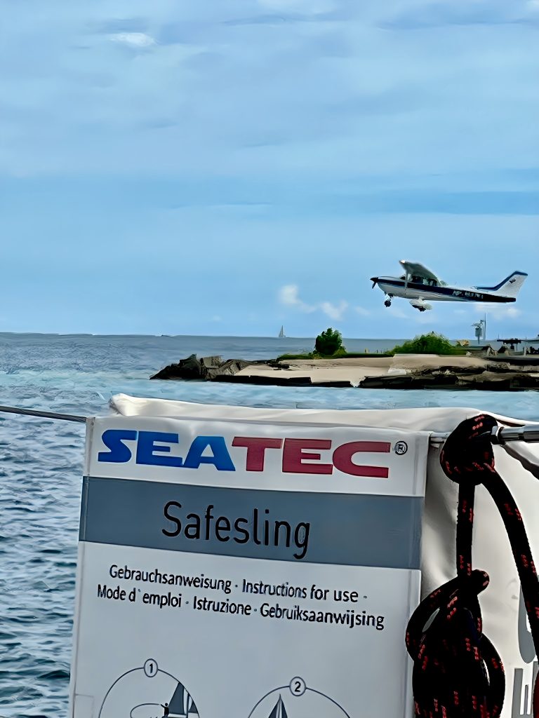 Kurze Zeit später, wir wollen gerade das Dinghy für die Überfahrt nach Porvenir startklar machen, kommen sie wieder. Ein Mann und 2 Frauen. Ich rufe, wir kaufen nichts, wir kaufen nichts, wir haben gestern schon…, da streckt er mir seine Hand hin und begrüßt mich freundlich. Willkommen in Guna Yala Islands, willkommen auf El Porvenir. Upsi… Ob wir zum Stempeln kommen, seine Frage? Jepp, das hatten wir gerade vor… Okay, er erwarte uns drüben und zuckelt ab. Will ich das ??? Da startet gerade ein Kleinflugzeug von der kurzen Lande- und Startbahn auf Porvenir.