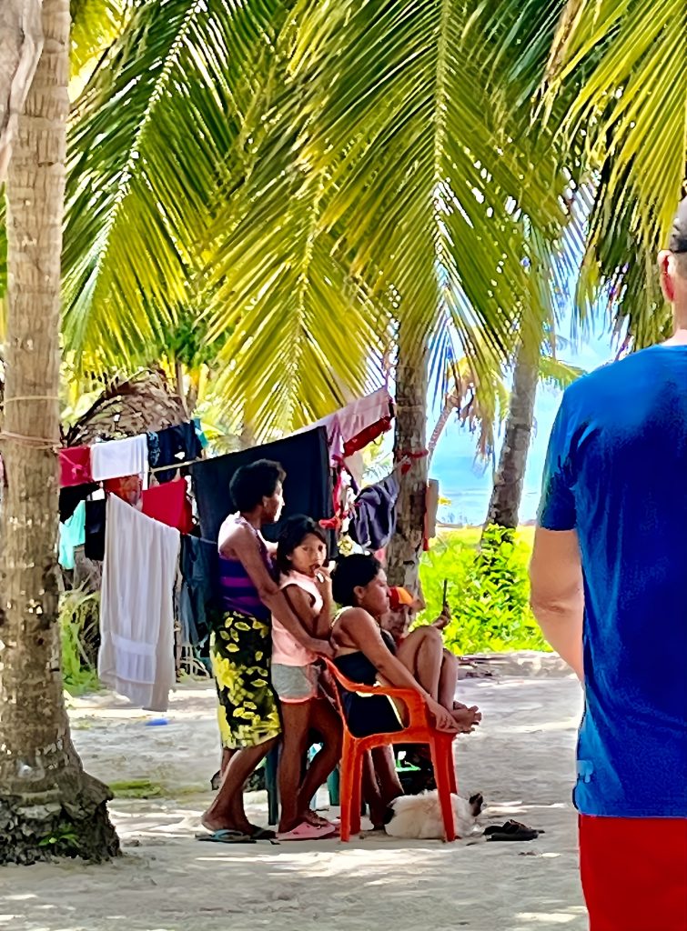 Ah, da sind ja mal ein paar Guna! Aber schau dir das an. Die älteste Tochter hält ein Handy vor sich und kleine Schwester, Mutter und zahnlose Oma schauen zu. Was da wohl läuft? Eine Telenovela? Irgendwie erscheint uns das Leben der Leute hier doch etwas bedrückend. Sehr arm, sehr reduziert, dennoch westlichen Einflüssen ausgesetzt und ziemlich alleine. Jedenfalls auf den entlegeneren Inseln. Rund um Porvenir waren die Inselchen picke packe vollgebaut, auch nicht wirklich schön. Jetzt sind wir an dem Inselstückchen, wo wir die vielen ankernden Boote gesehen haben.