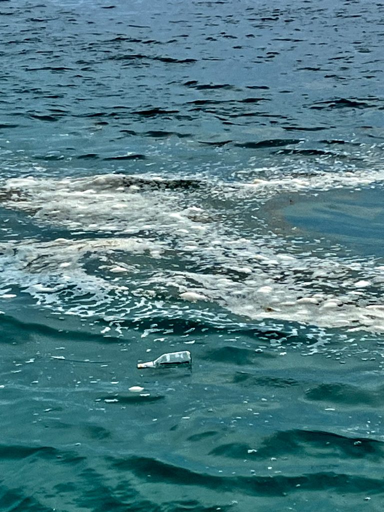 Kurze Zeit später läuft deren Generator, für Stunden… 🙄. Das hört sich an wie ein alter, lauter, knatternder Rasenmäher, nur duftet es nicht nach frisch gemähtem Gras. Trotzdem hören wir plötzlich ein Klopfen an unserem Boot. Was ist das? Ein Guna, der wieder etwas verkaufen möchte? Nein! Ach Gottchen, eine Sektflasche schaukelt unter Yuti hindurch und schlägt an.