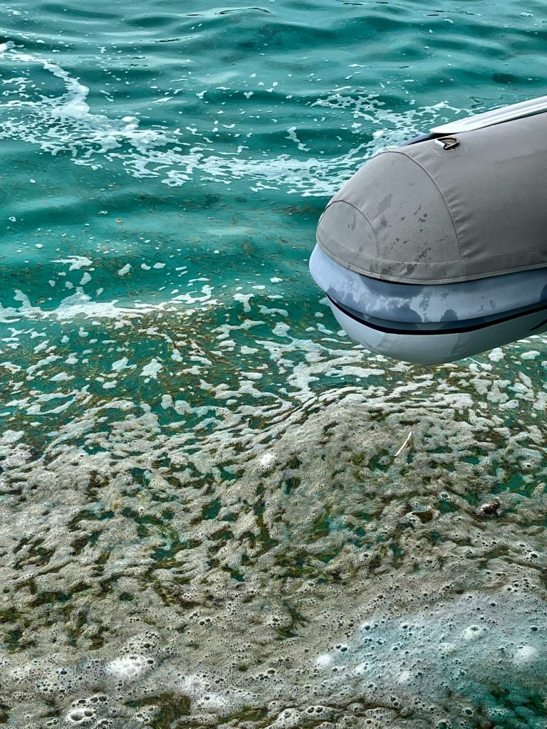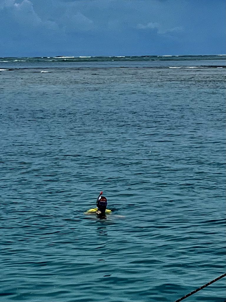 Klaus kommt vom Schnorcheln zurück, will aber noch unsere Dreckkante rund ums Boot wegputzen. Die haben wir uns vom Swimmingpool mitgenommen. Alle 4 Seiten schmücken eine 20 cm breite, gelbe „Zierkante“. Als Klaus endlich fertig ist, ist er auch mit seiner Kraft am Ende. Er hievt sich stöhnend aufs Boot zurück und später aufs Sofa.