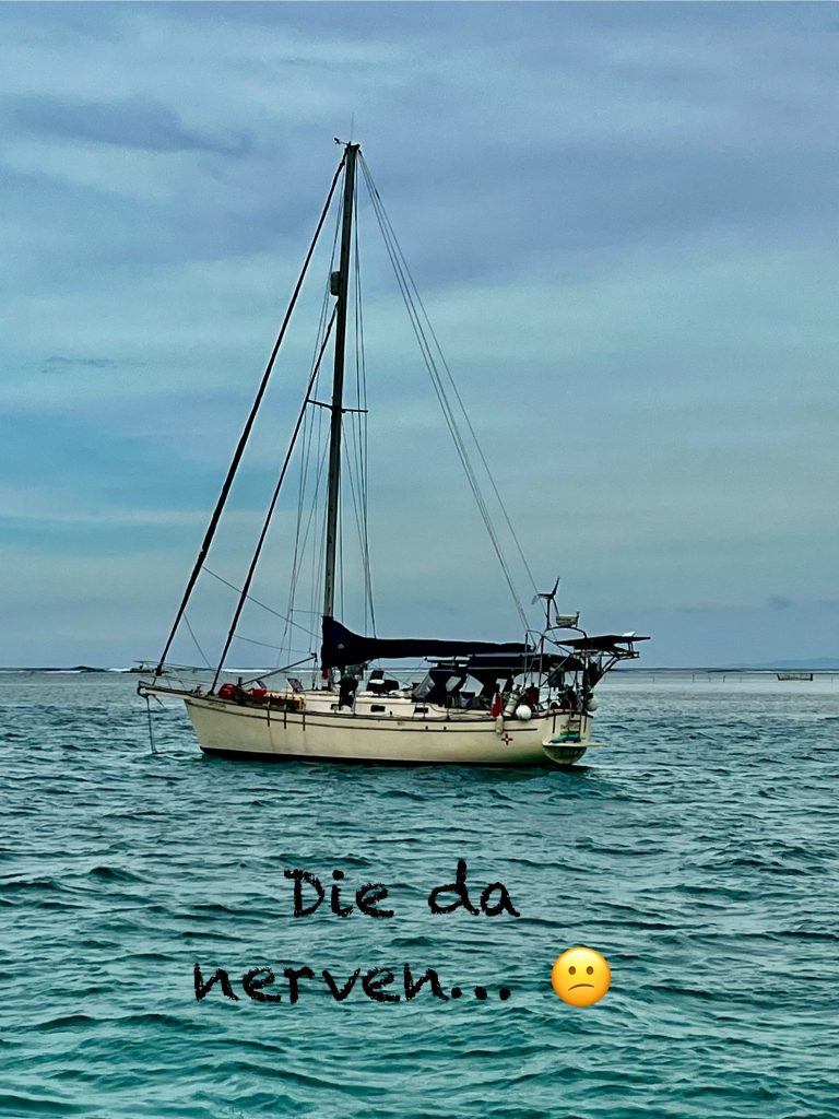 Dann kommt ein weiteres Boot. Ein etwas heruntergekommener Monohull mit fünf Leuten. Sie ankern ausgesprochen lässig, fahren den Anker nicht ein und liegen schlussendlich sehr dicht neben uns.
