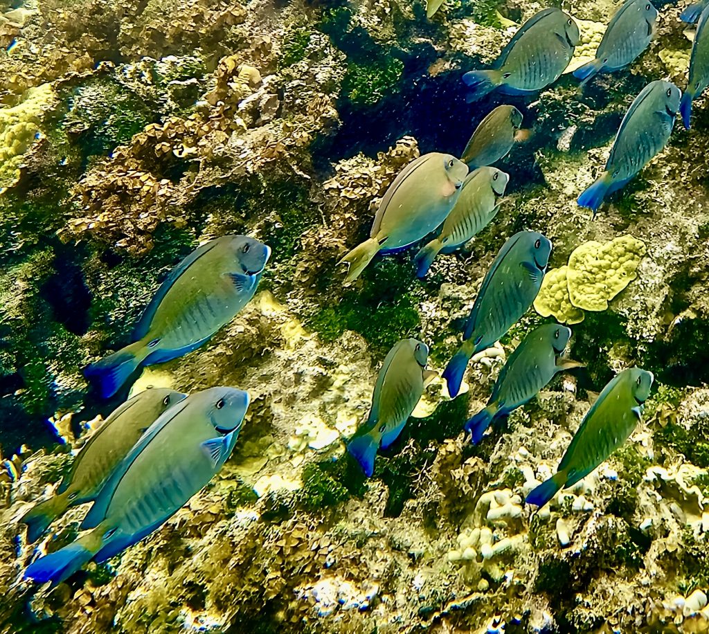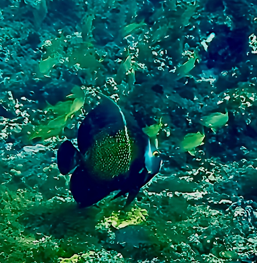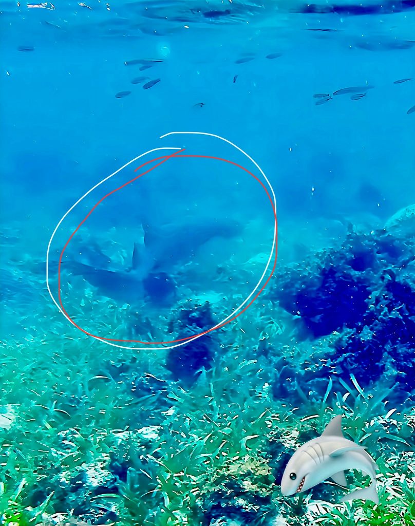 Jepp, ein Grauhai saust an mir vorbei, ich kann ihn gerade noch erhaschen, bevor er im milchigen Wasser verschwindet. War das der Grund für die Hellfärbung der Fische? So fallen sie im Riff natürlich nicht so stark auf. 🤔