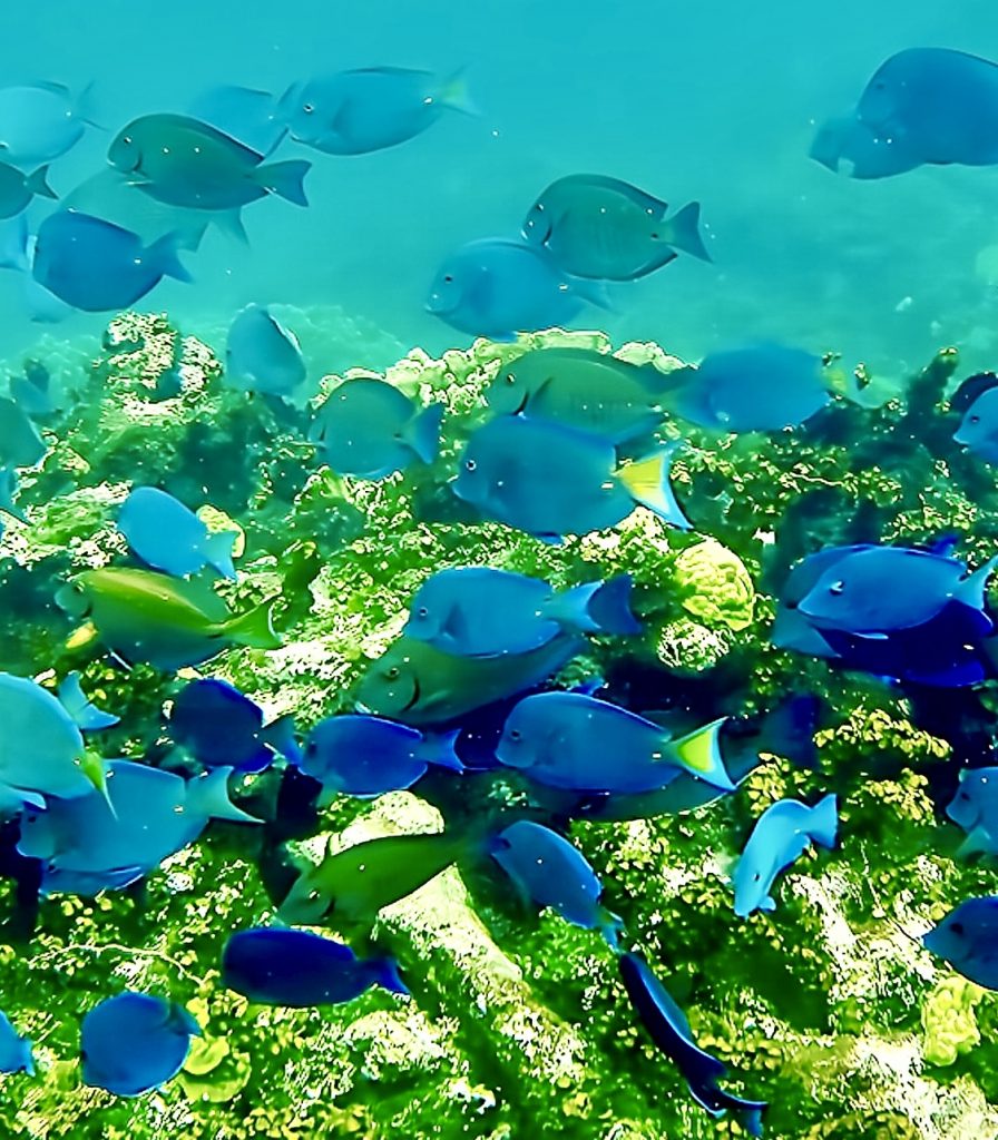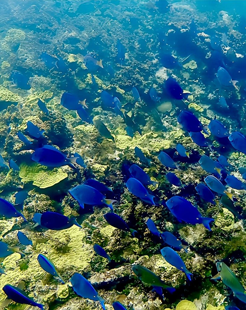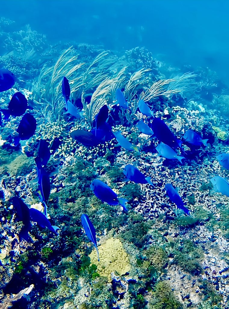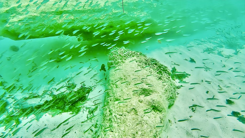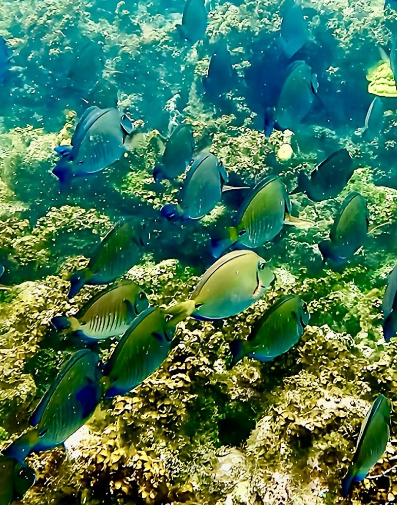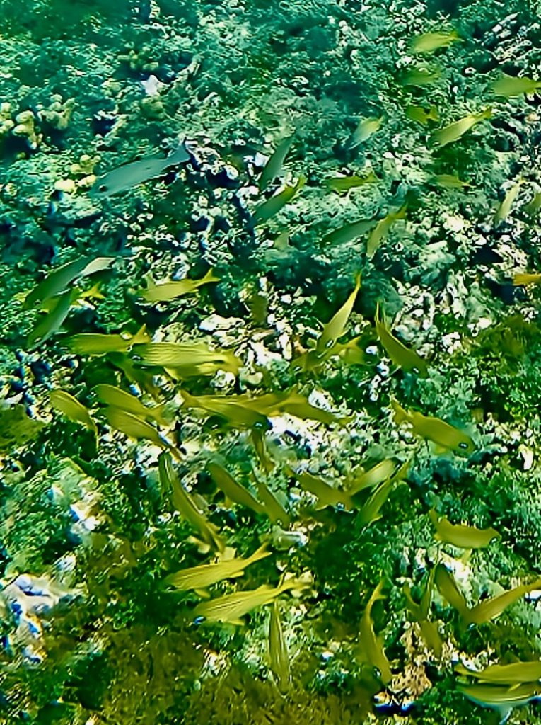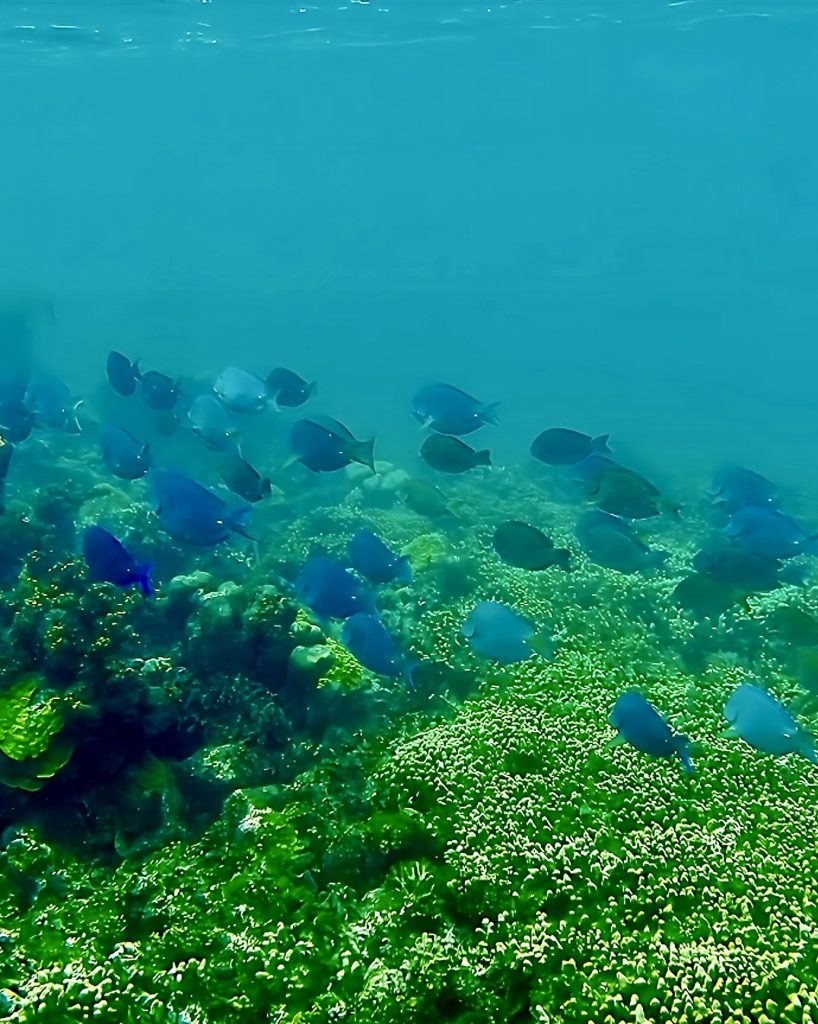 Jetzt ich: Flossen an, Brille auf, Schnorchel rein, Action Cam in die Hand und ab ins Wasser. 💦 Erst schwimme ich nur wenige Meter zu einem Inselchen, dem wir mit Yuti schon ganz schön nahe gekommen sind und stoße auf einen groooßen Schwarm kleiner Fischchen, die wohl immer um die Insel herumkreisen.