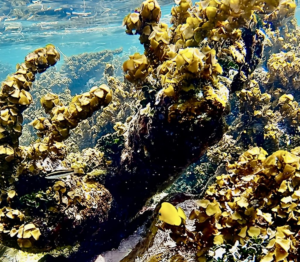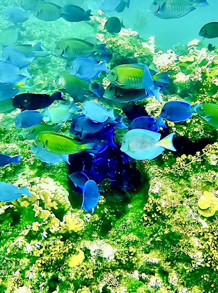 Jetzt schwimme ich in die entgegengesetzte Richtung, zum großen Riff und außen rum, um die dem offenen Meer zugewandte Seite zu erkunden. Jepp, da ist definitiv mehr los. Das Riff fällt steil zum Meer hin ab, und ich muss aufpassen, wenn ich etwas ins Riff hineinschwimme, dass mich die Wellen nicht auf spitze Riffkanten schleudern.