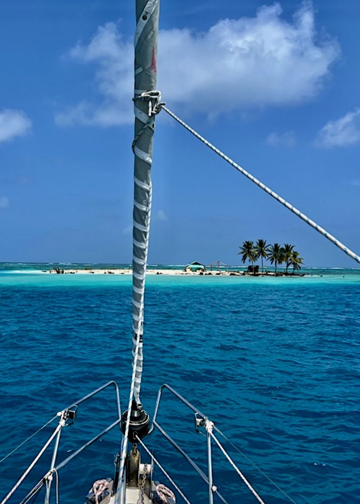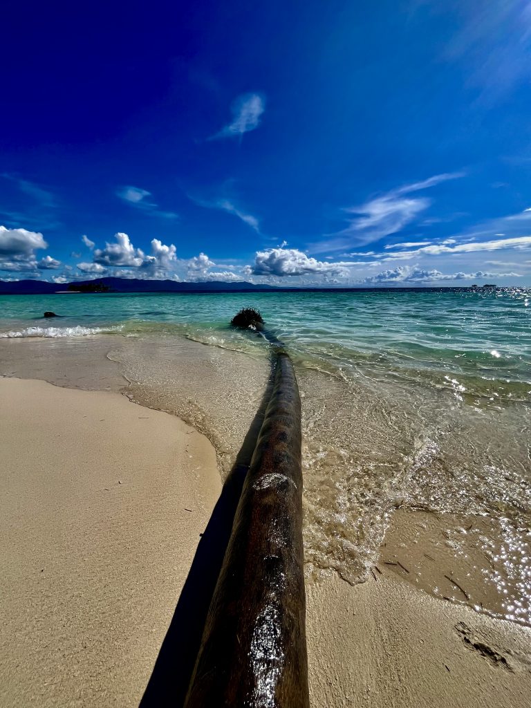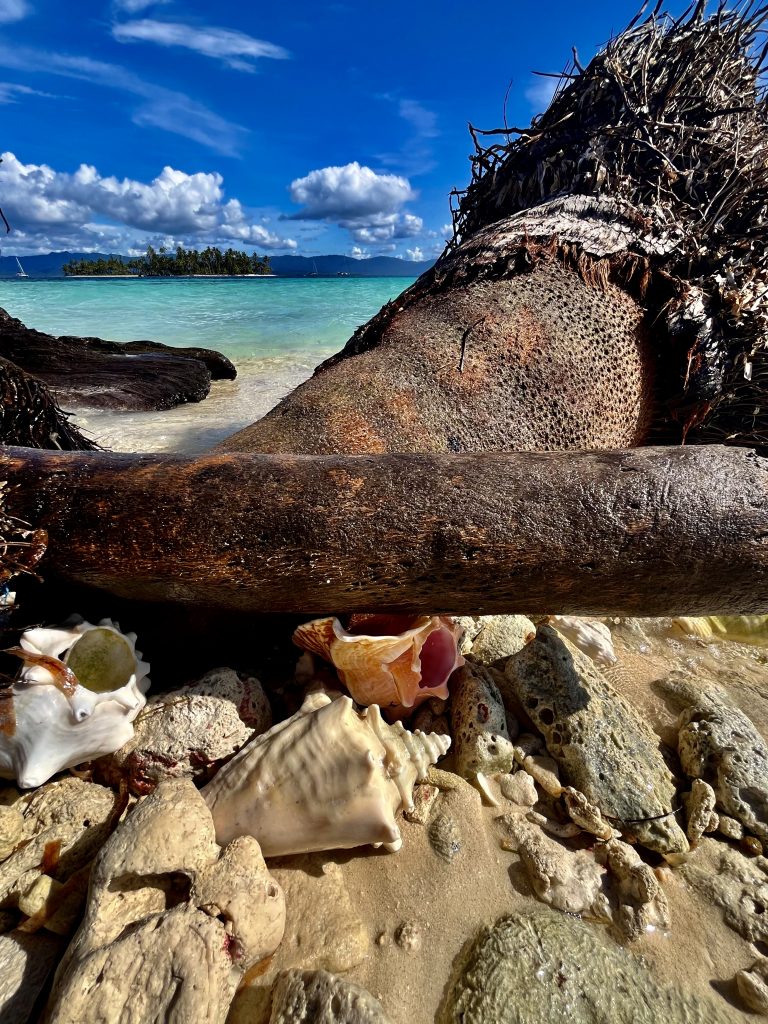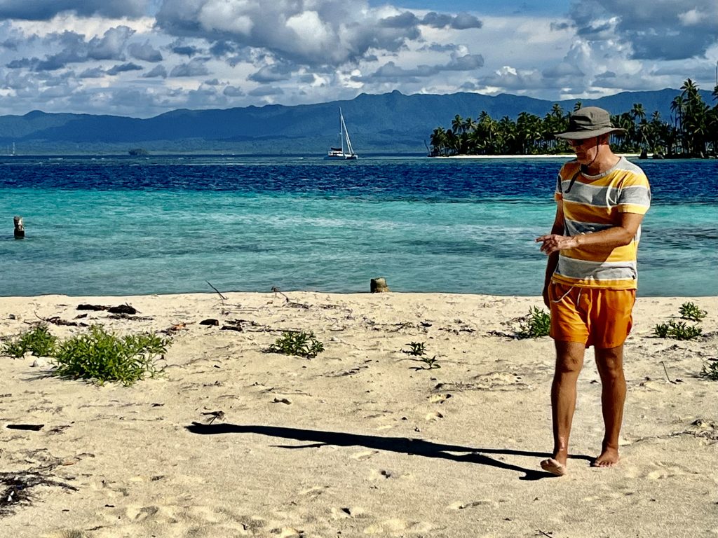 Dieses Mal verhalten sich die Touristen aber ruhig und friedlich. Viele von ihnen gehen schnorcheln, ich auch. Erst zu der einen Insel, wo wir fast schon mit Yuti draufgesessen haben und dann wieder zum Außenriff. Ein schöner Ausflug❣️ Klaus entschließt sich nochmal zur Sandbank, nein, nicht zu paddeln, sondern zu schnorcheln, alleine, um noch eine weitere Konch zu holen. Später wird er mir erzählen, dass auf dem Hinweg, etwa 3 Meter unter ihm, ein mächtige Grauhai in Richtung Boote durchschwamm. Er interessierte sich nicht für ihn, aber Klaus hatte ja noch den Weg zurück vor sich. Und der Hai ging ihm nicht mehr aus dem Kopf. Per Fernglas halte ich ihn im Auge 👁️👁️ 🔭. Würde ich eigentlich sehen wollen, wenn ihm unterwegs etwas passieren würde, so Hai technisch?? Aber jetzt kann ich sehen, dass er auf der Insel unversehrt angekommen ist. Eigentlich ist es gerade sehr idyllisch hier. Es ist ruhig, die Sonne glitzert auf dem Wasser, die Vögel zwitschern, ein Guna fischt, 2 Pelikane tuen es ihm gleich, ein weiterer Guna schnitzt aus einem Baum ein Boot, und Klaus wäscht auf der Sandbank ein Schneckengehäuse aus. Übrigens, Apio ist nicht mehr erschienen. Vielleicht sucht er uns auf Green Island?? Dann ist Klaus zurück mit einer sehr großen Konch, leer natürlich!! Er trug sie wie ein Schild vor sich her und wollte im Notfall die Spitze in den Hai rammen… 😝. Zum Glück wurde dieser Einsatz des Schneckenhauses nicht erforderlich!