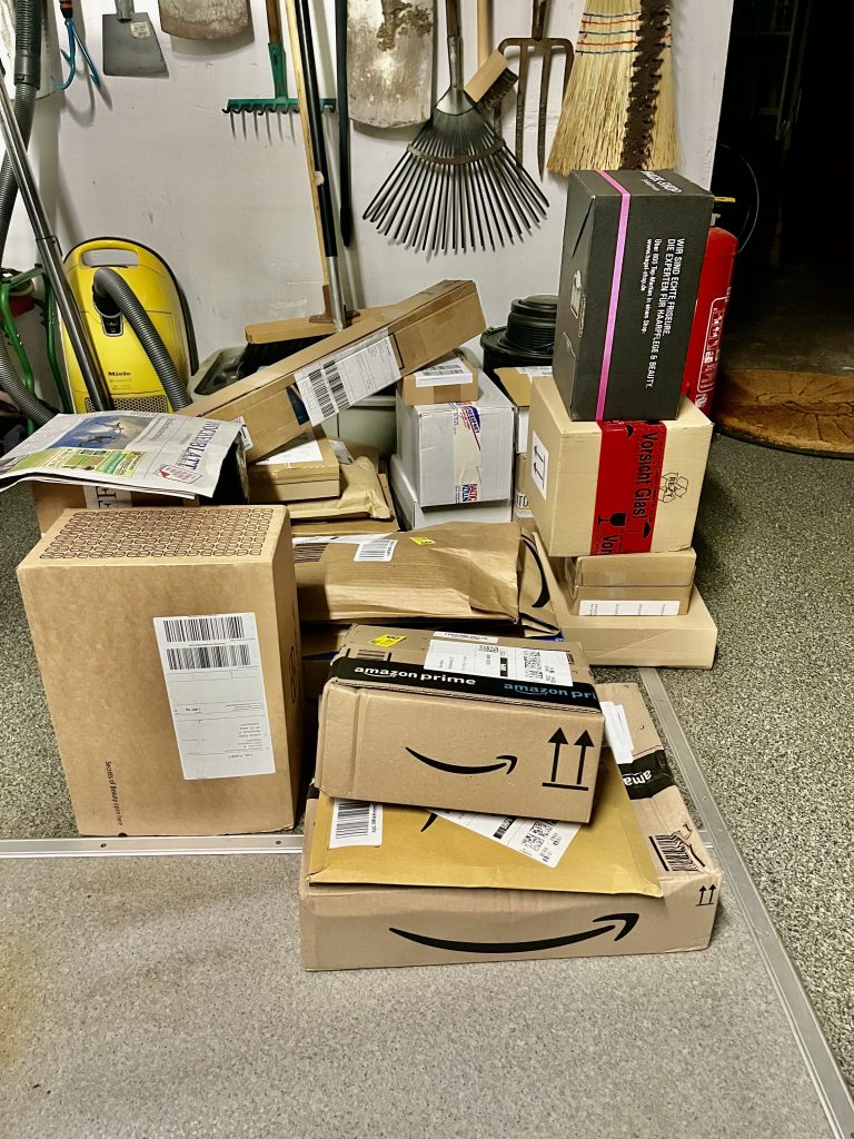 Nach der Landung in Frankfurt, erwartet uns ein leckeres Abendbrot bei Familie Kißler. Wir sind die Gäste. Janek fährt uns später von dort prima nach Hause, wir fühlen uns wie Gäste. Beim Reinfahren in die Garage müssen wir kurz laut lachen. 😂 Ein riesiger Haufen Pakete und Päckchen liegt dort aufgetürmt.