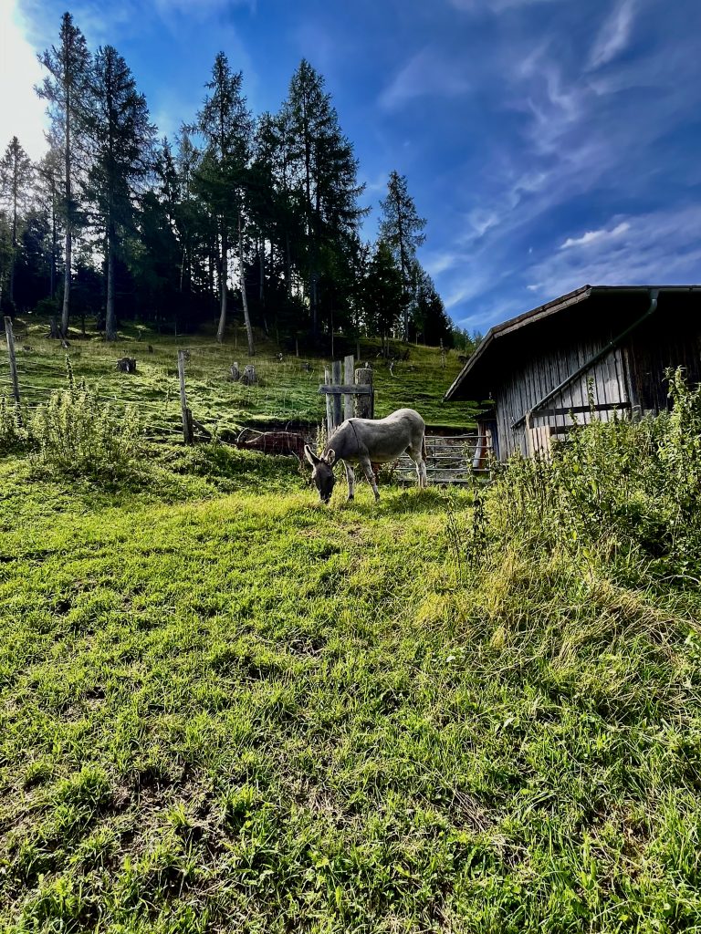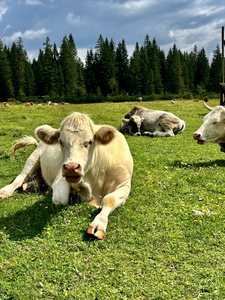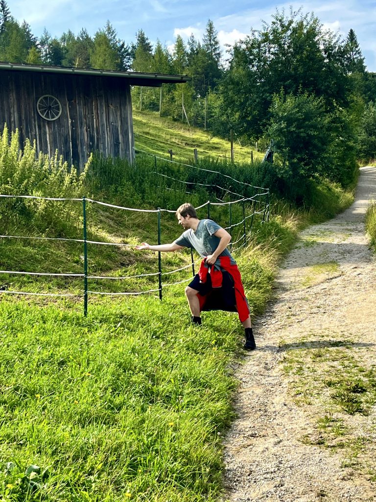 Irgendwann erreicht Norman das Ziel und wirft sein Fahrrad erstmal von sich, von Klaus ist nichts zu sehen. Komisch! Dann meldet er sich via Handy und sagt, er bleibe bei der tiefergelegenen Alm, macht Brotzeit und fährt dann wieder zurück. Sein Rad, nein, Larissas Rad schafft den Berg einfach nicht. 😳 Später wird sich herausstellen, dass Larissas Rad ein Straßenrad ist und nicht wirklich für bergige Schotterstrecken geeignet ist. Da dreht das Rad schnell durch und nimmt den Elektroabtrieb sofort raus. Ahhh, also liegt es nicht am zu schlappen Klaus. 😂 Norman fährt zu ihm runter und gemeinsam radeln sie zurück.