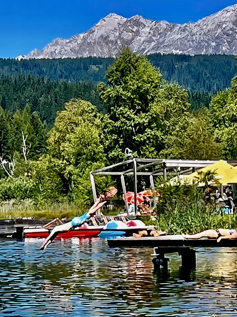 Am folgenden Tag geht’s ins traumhafte Naturschwimmbad, ein 18 Grad kalter Bergsee. 🥶
