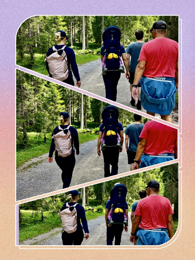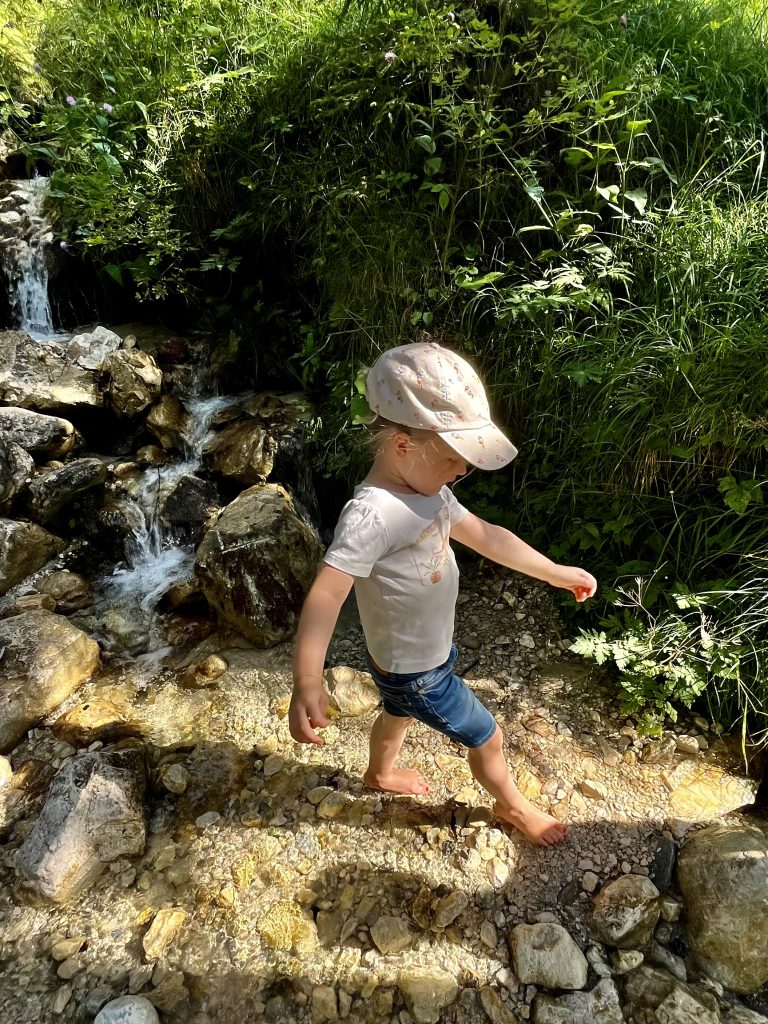 Wir wandern zur Wildmoos Alm, nur Alva lässt sich tragen. Das Laufen steht nicht sooo hoch bei ihr im Kurs. Gut dass der Papa so viel Kraft hat!