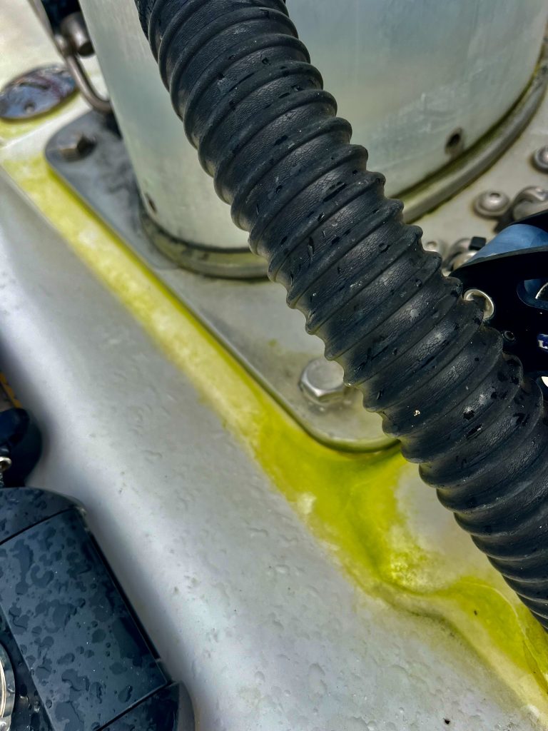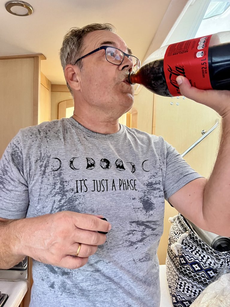 und siehe da, sie läuft wieder im wahrsten Sinne des Wortes. Jetzt läuft’s wieder plätschernd aus dem Boot heraus, so soll es sein. Ein Glück, denn ohne Klima würde man hier nen Koller bekommen. Darauf erstmal einen ordentlichen Schluck Cola!