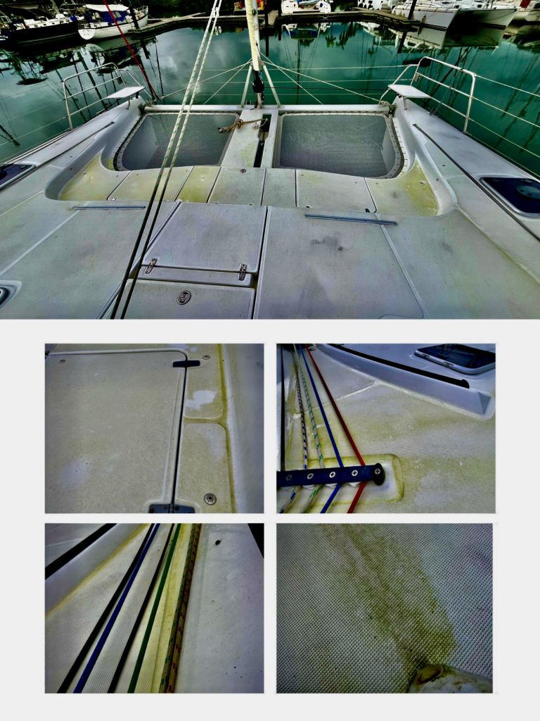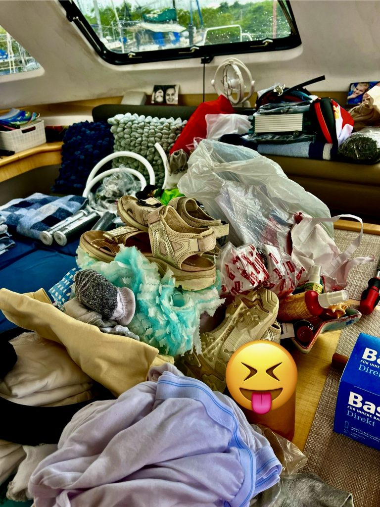 Und das ist nur ein klitzekleiner Teil des ganzen Wustes. Mann, wo soll das nur alles hin, in einem kleinen Boot, das bereits voll ist! 🤔 Und, wir haben jetzt nochmal gute 90 Kilo mehr an Gewicht. Das heißt, die Wasserlinie sinkt nochmals ab und das Wasser steigt auf Klaus‘ Seite bereits über das Antifouling. Nicht gut! Wir liegen jetzt deutlich schief im Wasser. Das will ich aber so nicht haben. Da müssen wir noch umpacken…
