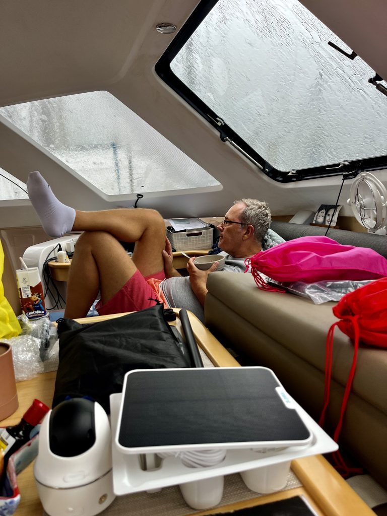 Und nun habe ich Herzschmerzen. ❤️🩹 Die Abreise fiel mir richtig schwer. Meine Kinder und meine Enkeltochter fehlen mir jetzt schon. Vielleicht liegt es an der unüberschaubaren Länge unseres Fortseins? Oder vielleicht daran, dass es jetzt nicht flott weitergeht? Ich muss wohl erst wieder ins Bootsleben zurückfinden und meinen Entdeckermove wiederfinden. Auch ist die schwüle, nasse Tropenhitze anstrengend. So, genug mit dem Gejammer, die Klimaanlage braucht uns.