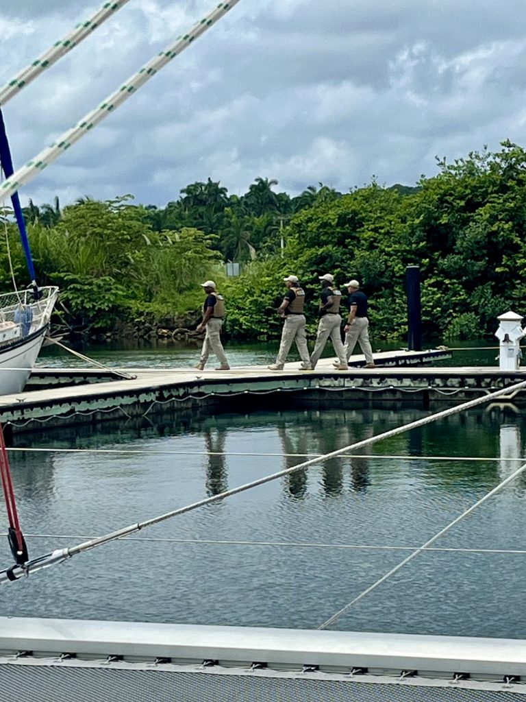 Es ist 10:43 Uhr, die Officer sind an unserem Boot und kontrollieren unsere Pässe. Mann, was ist das für ein Aufgebot?!? Acht Männer und eine Frau in Militäruniform. Bei uns sind sie schnell fertig und ziehen weiter. Schöne Sonntagsmorgenrazzia!