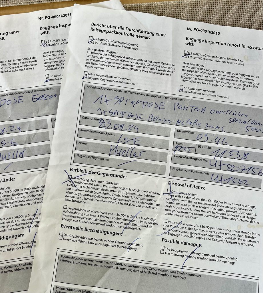 Scheiße, noch in Frankfurt wurden 3 Sprayflaschen entfernt und vernichtet. Ein Gelcoatspray, ein Reinigungsspray und, besonders bitter, ein Pantera Oberflächenspezialreiniger. Den wollte Klaus als Untergrundvorbereiter fürs Ankleben der Saildrivegummis verwenden. Mist! ABER, die wichtigsten Utensilien sind mitgekommen! 😮💨 Wie zum Beispiel der ultimative KLEBER für die Saildrivegummis. Der hätte eigentlich auch nicht ins Gepäck gedurft… Und von den Zollwerten ganz zu schweigen! Schlußendlich haben wir dann doch eine große Schweinebacke gehabt. 🐽 Darauf erstmal eine Schüssel Frosties…