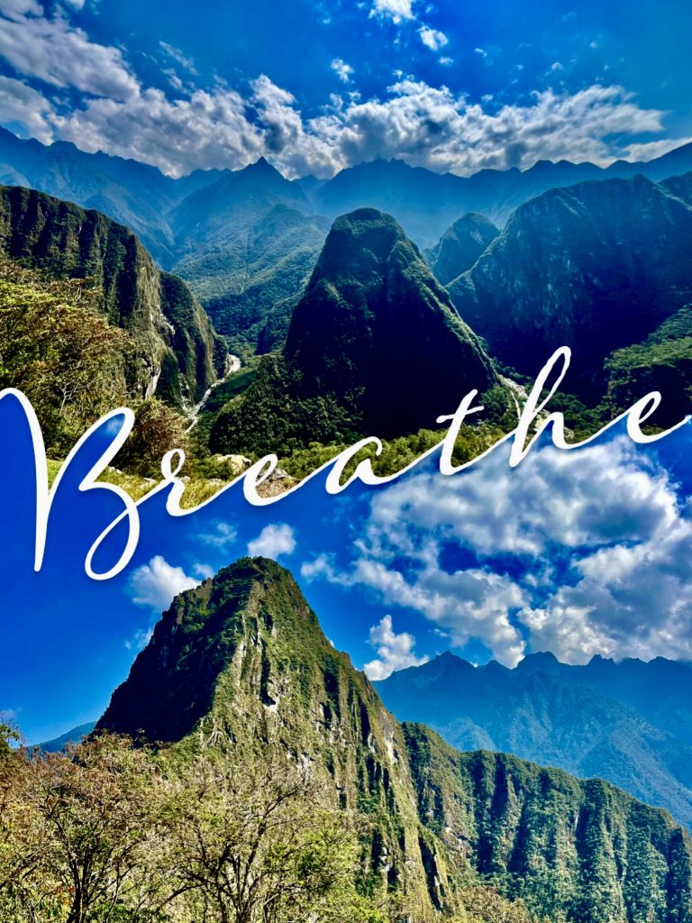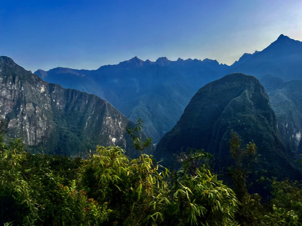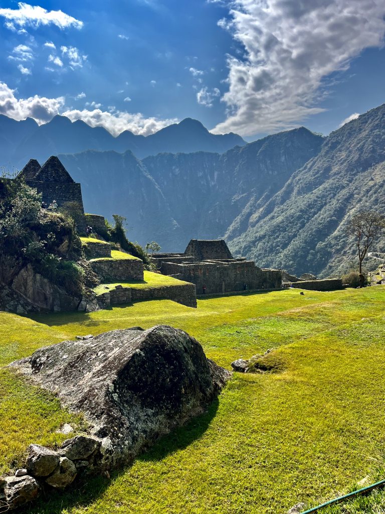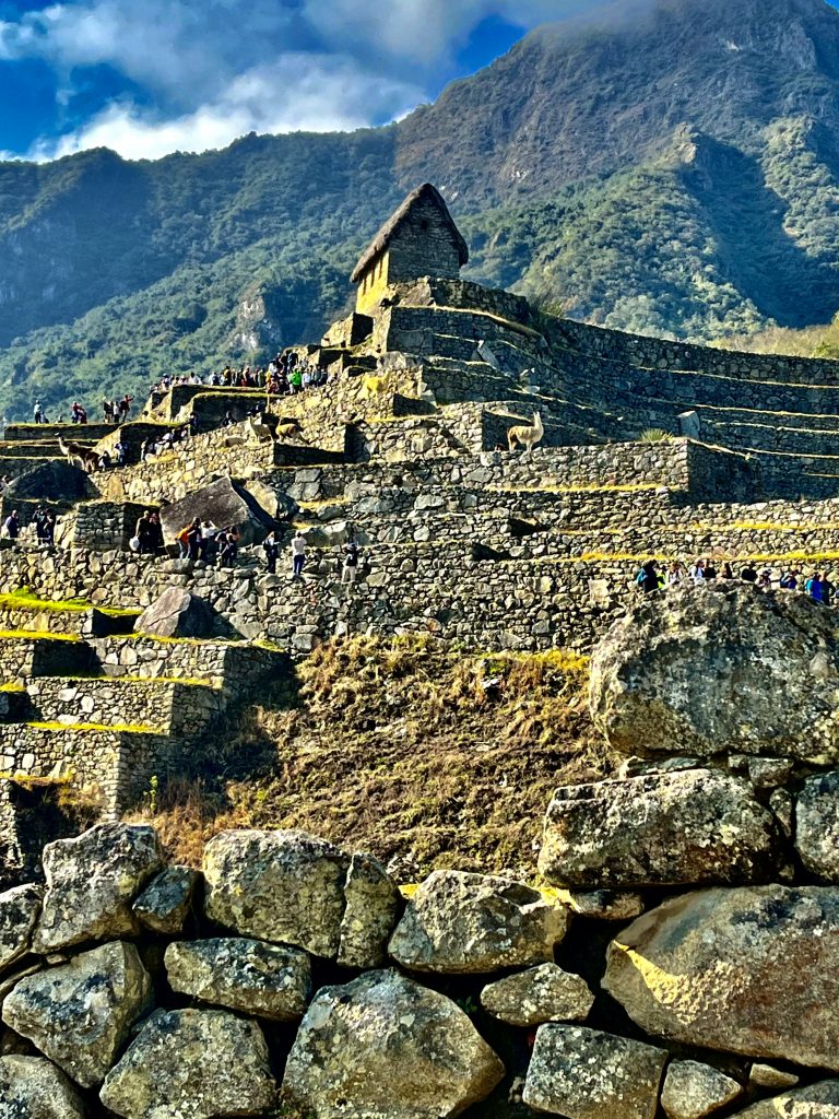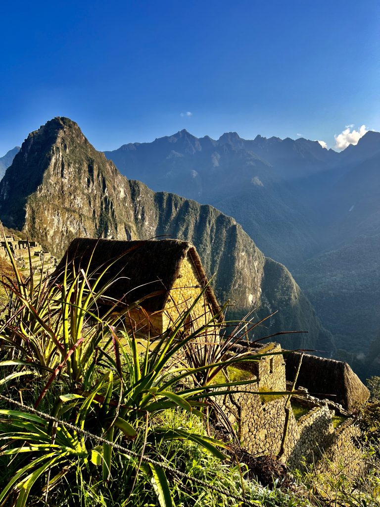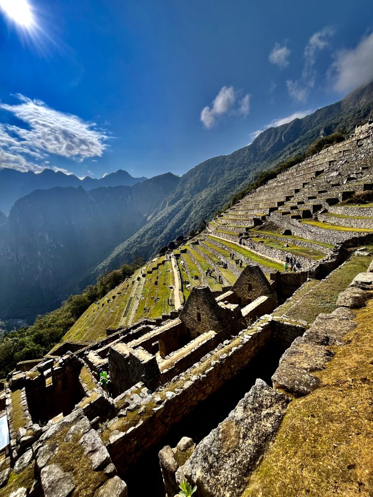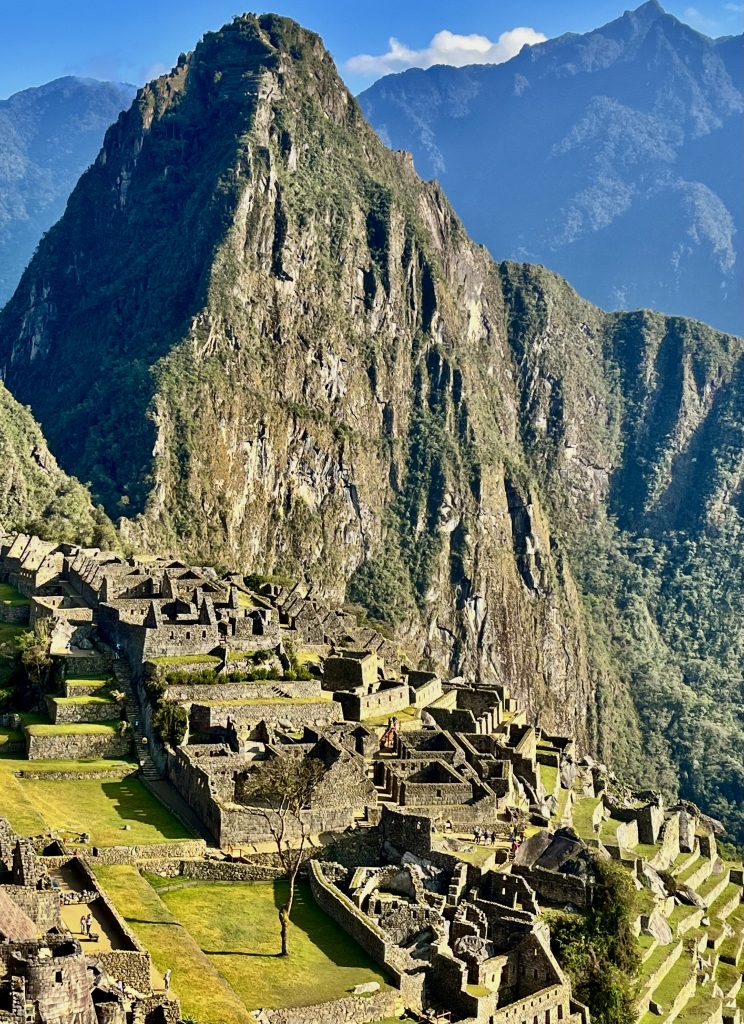 Jetzt aber mal wieder ernsthaft werden, den Blick genießen und etwas lernen! Der Berg auf dem wir uns befinden und auf die Ruinenstadt hinunterblicken heißt Machu Picchu. Das ist die alte Inka-Sprache Quechua und heißt übersetzt “Alter Berg” oder “Alter Gipfel”. Daher kommt auch der Name für diesen absolut besonderen Ort. Wie die Stadt damals wirklich hieß, weiß man nicht so genau. Oder doch? Vielleicht einfach nur Picchu = Berg bzw. Gipfel. Der kleinere Berg auf den wir schauen und der einem kleinen Zuckerhut ähnelt, nennt sich auf Quechua “Huayna Picchu”.