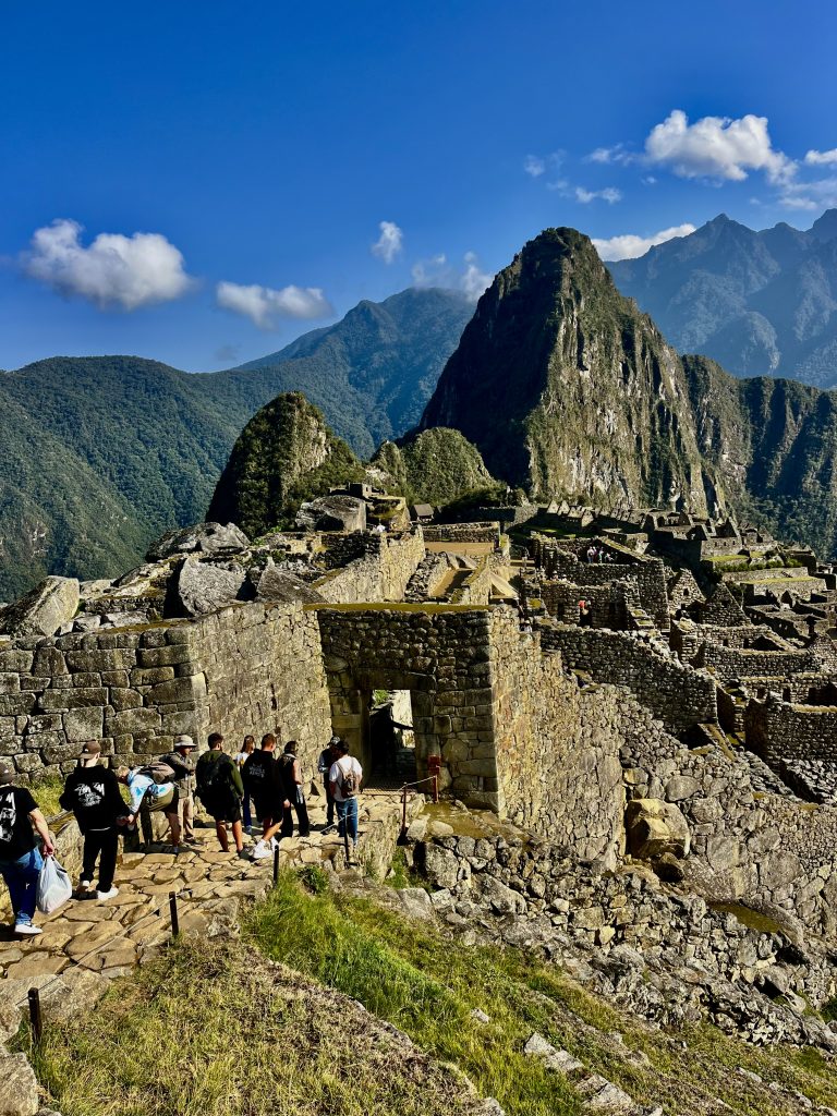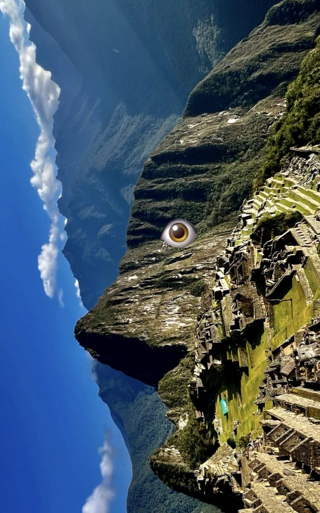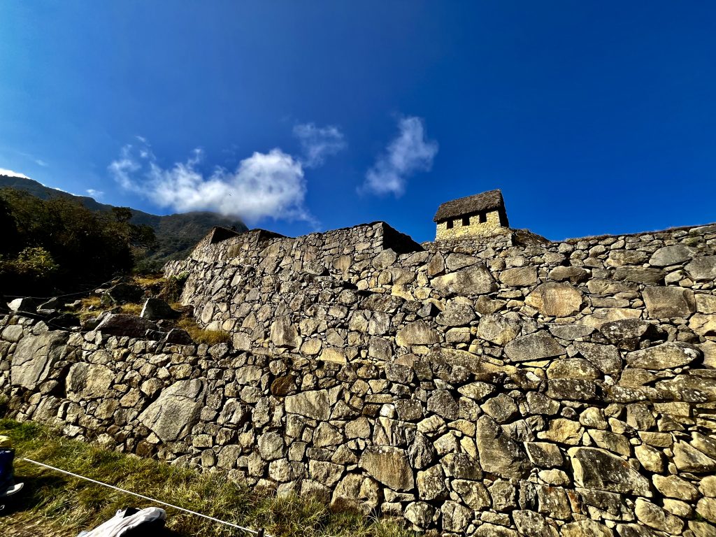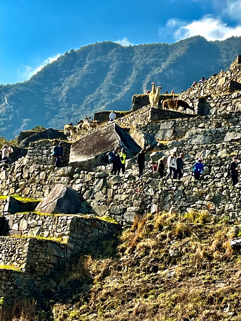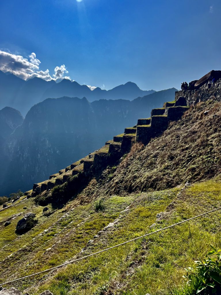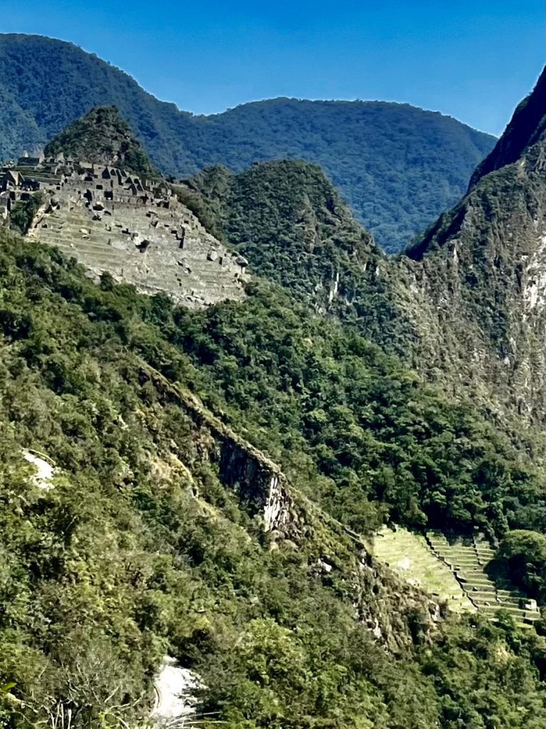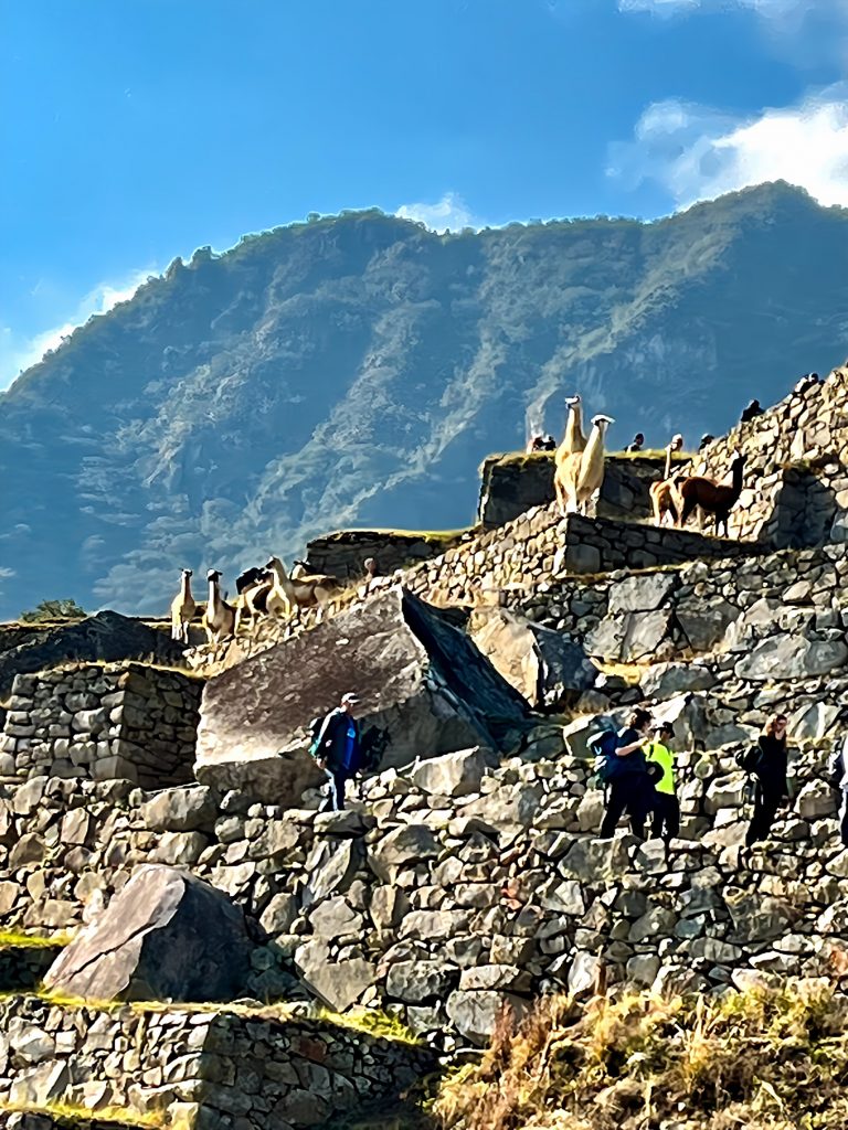 Der Himmel ist strahlend blau. Das ist super!!! Oft liegt ein Wolkenschleier über Machu Picchu oder es nieselt. Wir haben richtig Glück, warten aber immer noch auf Joel und ein Zeichen. Eine halbe Stunde bestimmt schon. Schritt für Schritt tasten wir uns etwas vor. Irgendwann winkt ein Vermummter Klaus zu, ich habe es gar nicht bemerkt. Jetzt aber schnell. Wir steigen einige Treppen hoch, da sehe ich Joel oben rechts stehen und nehme die rechte Treppe zu ihm rauf. Klaus sieht ihn nicht und läuft einem Aufpasser geradewegs in die Arme. Mist! Der will Klaus’ Eintrittskarte sehen. Obermist!! Aber Joel ruft dem Mann etwas zu und Klaus darf nun auch hoch zu uns. 😮💨 Es lebe die Korruption‼️Wir bekommen beide Ausweise mit Weg Nummer 2 um den Hals gehängt und laufen nun ganz offiziell auf diesem weiter. Juhuuu 🥳. Joel hat’s geschafft, juppiduppiduuu❣️ Guter Mann 👍.