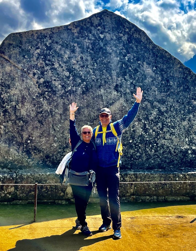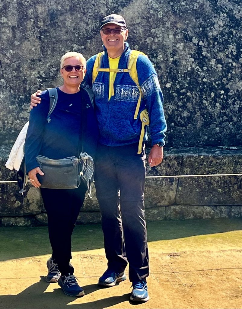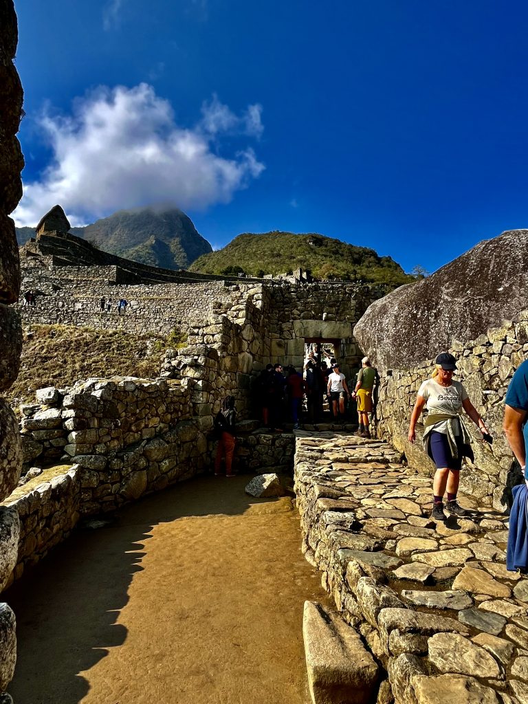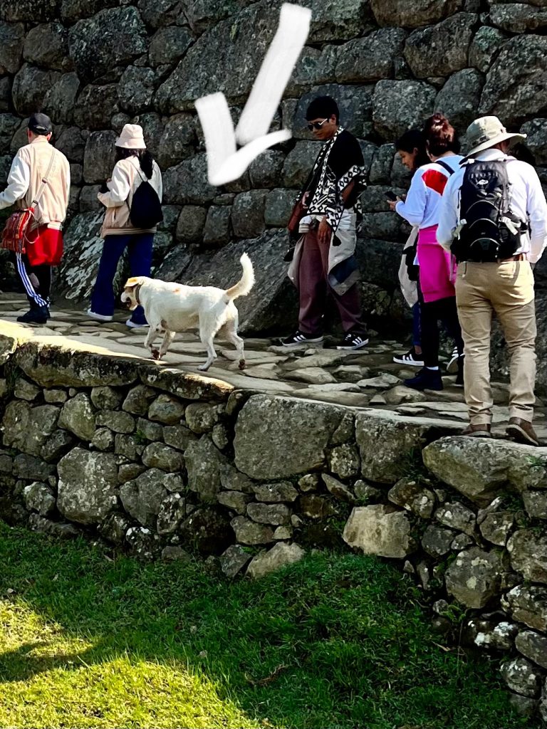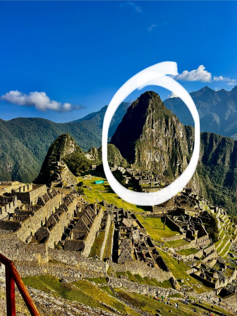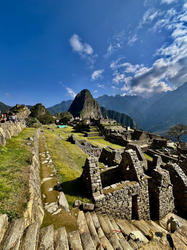 Der Himmel ist strahlend blau. Das ist super!!! Oft liegt ein Wolkenschleier über Machu Picchu oder es nieselt. Wir haben richtig Glück, warten aber immer noch auf Joel und ein Zeichen. Eine halbe Stunde bestimmt schon. Schritt für Schritt tasten wir uns etwas vor. Irgendwann winkt ein Vermummter Klaus zu, ich habe es gar nicht bemerkt. Jetzt aber schnell. Wir steigen einige Treppen hoch, da sehe ich Joel oben rechts stehen und nehme die rechte Treppe zu ihm rauf. Klaus sieht ihn nicht und läuft einem Aufpasser geradewegs in die Arme. Mist! Der will Klaus’ Eintrittskarte sehen. Obermist!! Aber Joel ruft dem Mann etwas zu und Klaus darf nun auch hoch zu uns. 😮💨 Es lebe die Korruption‼️Wir bekommen beide Ausweise mit Weg Nummer 2 um den Hals gehängt und laufen nun ganz offiziell auf diesem weiter. Juhuuu 🥳. Joel hat’s geschafft, juppiduppiduuu❣️ Guter Mann 👍.