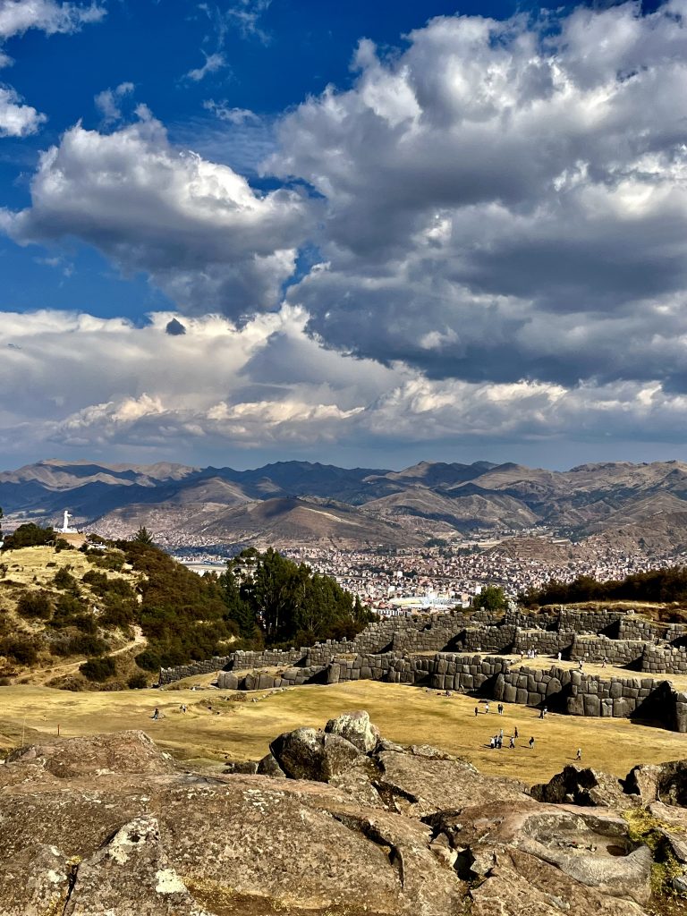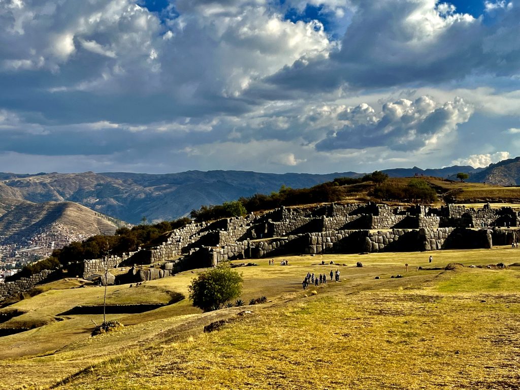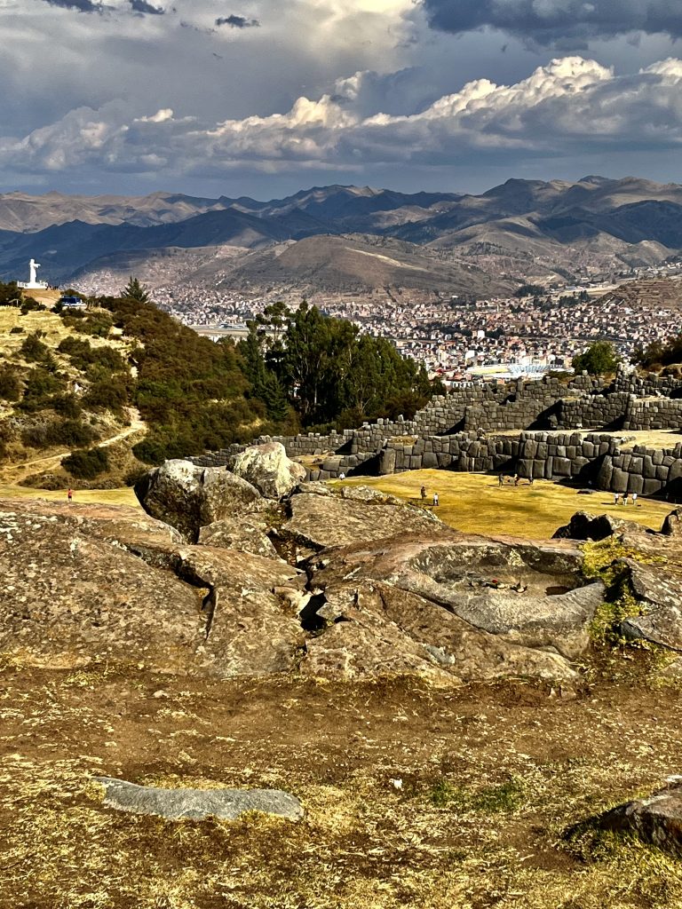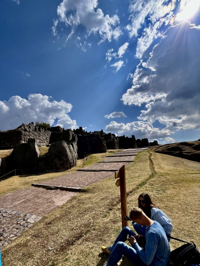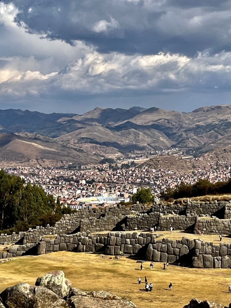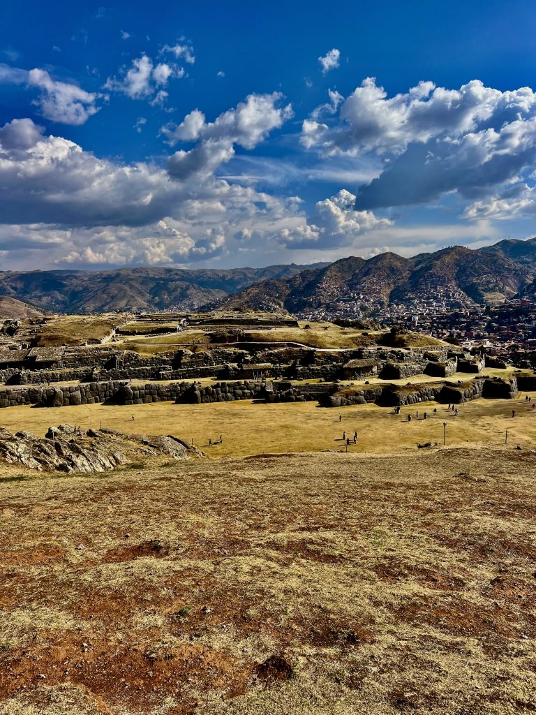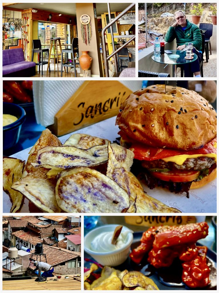 Das ist unser neues Hotel, siehe oben, für die nächsten 2 Nächte. Es ist sehr spanisch angehaucht. Dieser klassisch-spanische Stil könnte auch in Barcelona oder auf Mallorca zu finden sein. Unser Bett ist auf der Maisonette. Noch höher… 😮💨. Also echt jetzt, die fast 3.500 Meter Höhe macht uns wirklich zu schaffen. Unsere Nasen sind immer verstopft, ich habe immer leichte Kopfschmerzen und Schnappatmung, Klaus auch, und dazu habe ich noch endlos zappelige Beine, fürchterlich!!! Wir müssen unsere Körper etwas besser an die Höhe gewöhnen. Also steigen wir noch etwas höher hinauf, zum Haus der Sonne. Sacsayhuamán ist unser Ziel, eine riesige Anlage der Inka, die sowohl religiösen als auch Verteidigungszwecken diente. Sie liegt 3 Kilometer oberhalb von Cusco‘s Stadtzentrum. Wir lassen uns von einem Uber zum Eingang kutschieren, zahlen den Eintritt und steigen über Stufen und Wege hinauf. Langsam, ganz langsam und mit Päuschen. 😅 Stimmt ja gar nicht, stimmt ja gar nicht! Wir machen noch vor dem Eingang unsere erste Pause und spachteln ein leckeres, spätes Mittagessen, in einem sehr stylischen Lokal. 😆