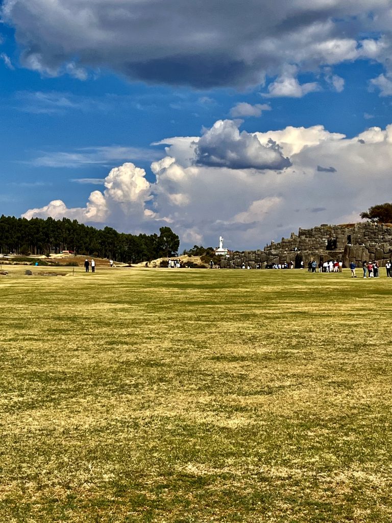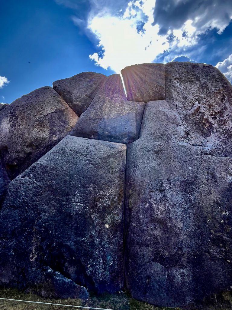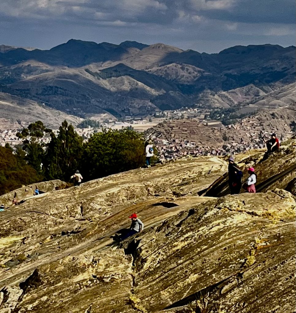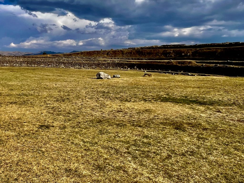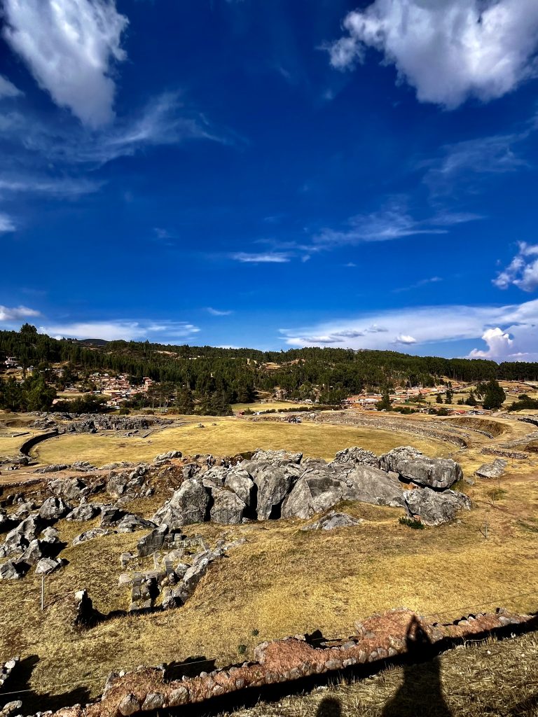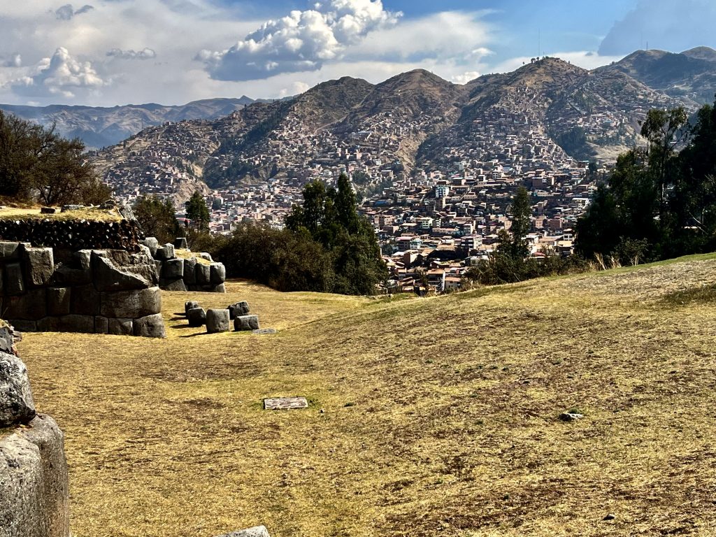 Das ist unser neues Hotel, siehe oben, für die nächsten 2 Nächte. Es ist sehr spanisch angehaucht. Dieser klassisch-spanische Stil könnte auch in Barcelona oder auf Mallorca zu finden sein. Unser Bett ist auf der Maisonette. Noch höher… 😮💨. Also echt jetzt, die fast 3.500 Meter Höhe macht uns wirklich zu schaffen. Unsere Nasen sind immer verstopft, ich habe immer leichte Kopfschmerzen und Schnappatmung, Klaus auch, und dazu habe ich noch endlos zappelige Beine, fürchterlich!!! Wir müssen unsere Körper etwas besser an die Höhe gewöhnen. Also steigen wir noch etwas höher hinauf, zum Haus der Sonne. Sacsayhuamán ist unser Ziel, eine riesige Anlage der Inka, die sowohl religiösen als auch Verteidigungszwecken diente. Sie liegt 3 Kilometer oberhalb von Cusco‘s Stadtzentrum. Wir lassen uns von einem Uber zum Eingang kutschieren, zahlen den Eintritt und steigen über Stufen und Wege hinauf. Langsam, ganz langsam und mit Päuschen. 😅 Stimmt ja gar nicht, stimmt ja gar nicht! Wir machen noch vor dem Eingang unsere erste Pause und spachteln ein leckeres, spätes Mittagessen, in einem sehr stylischen Lokal. 😆