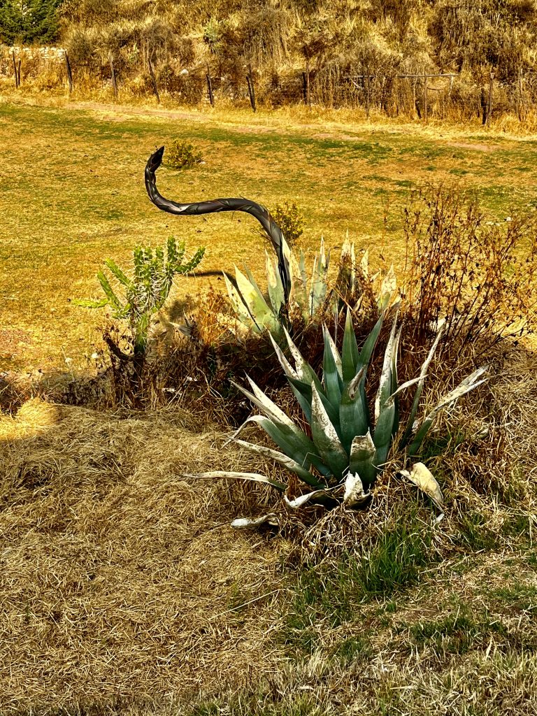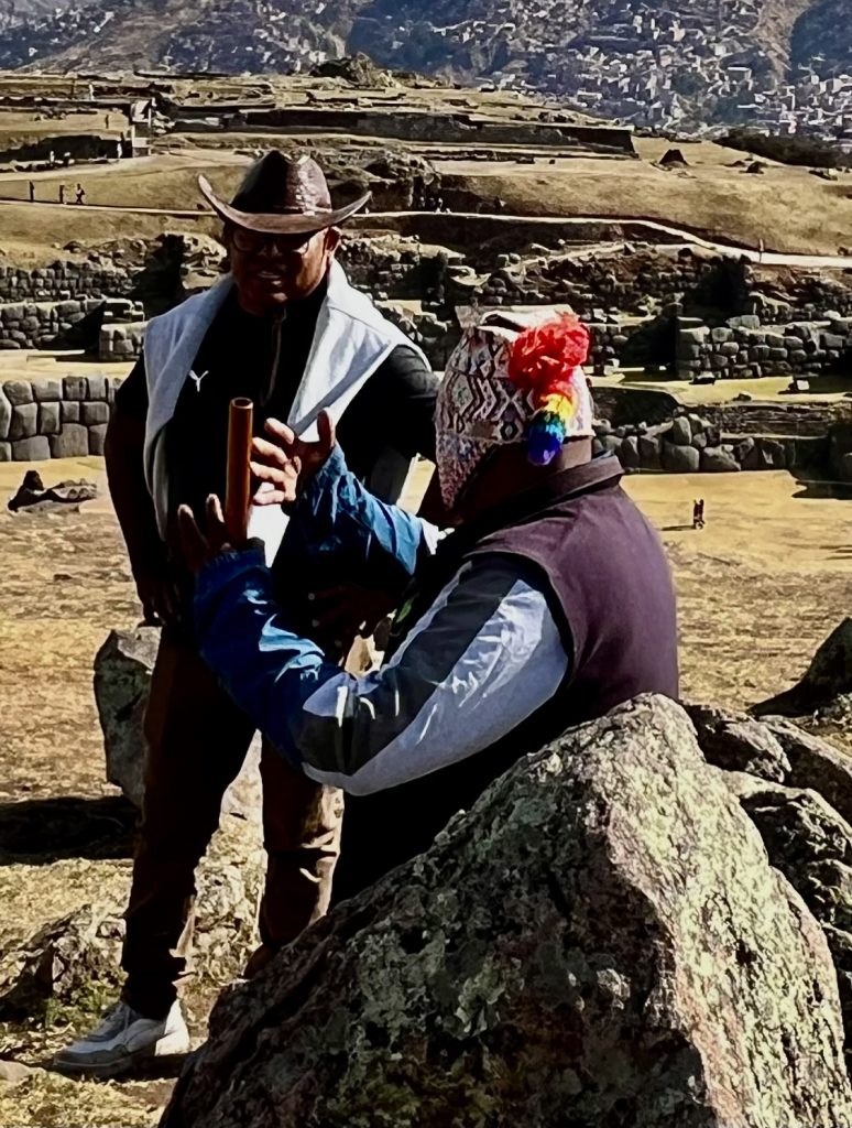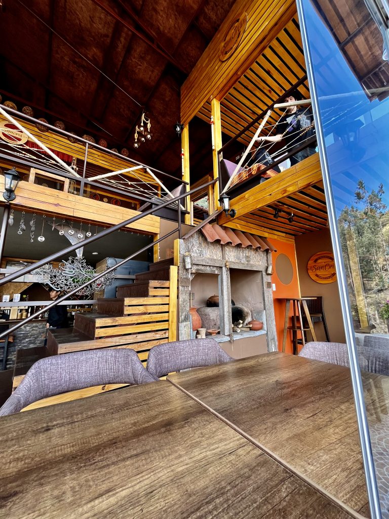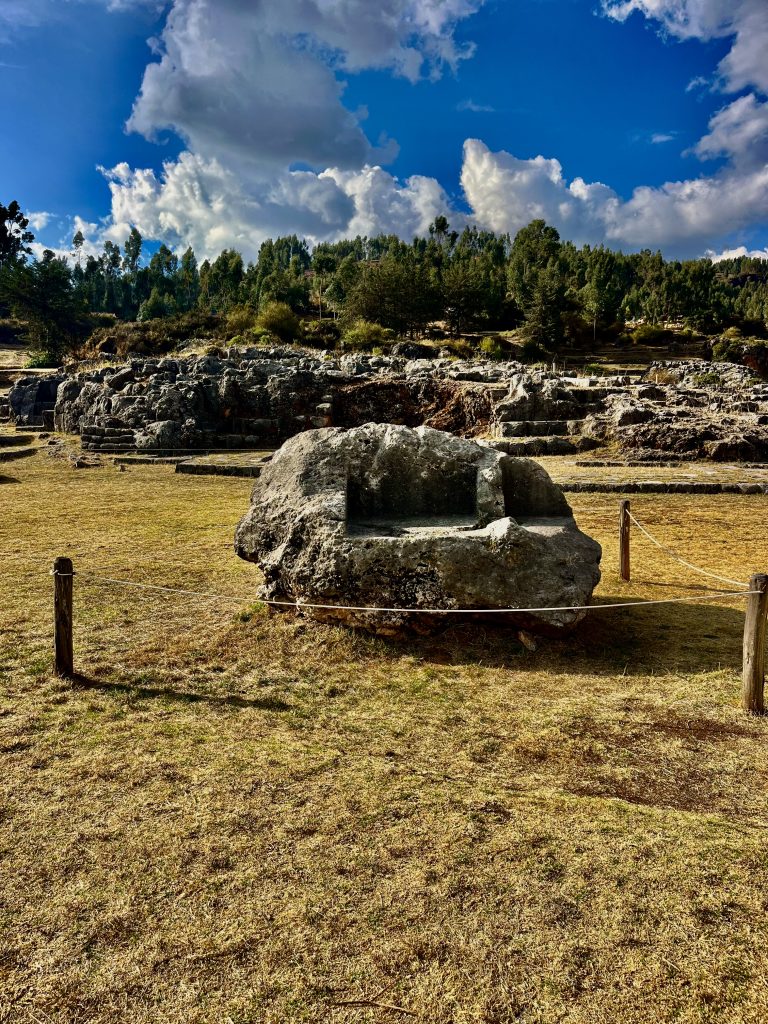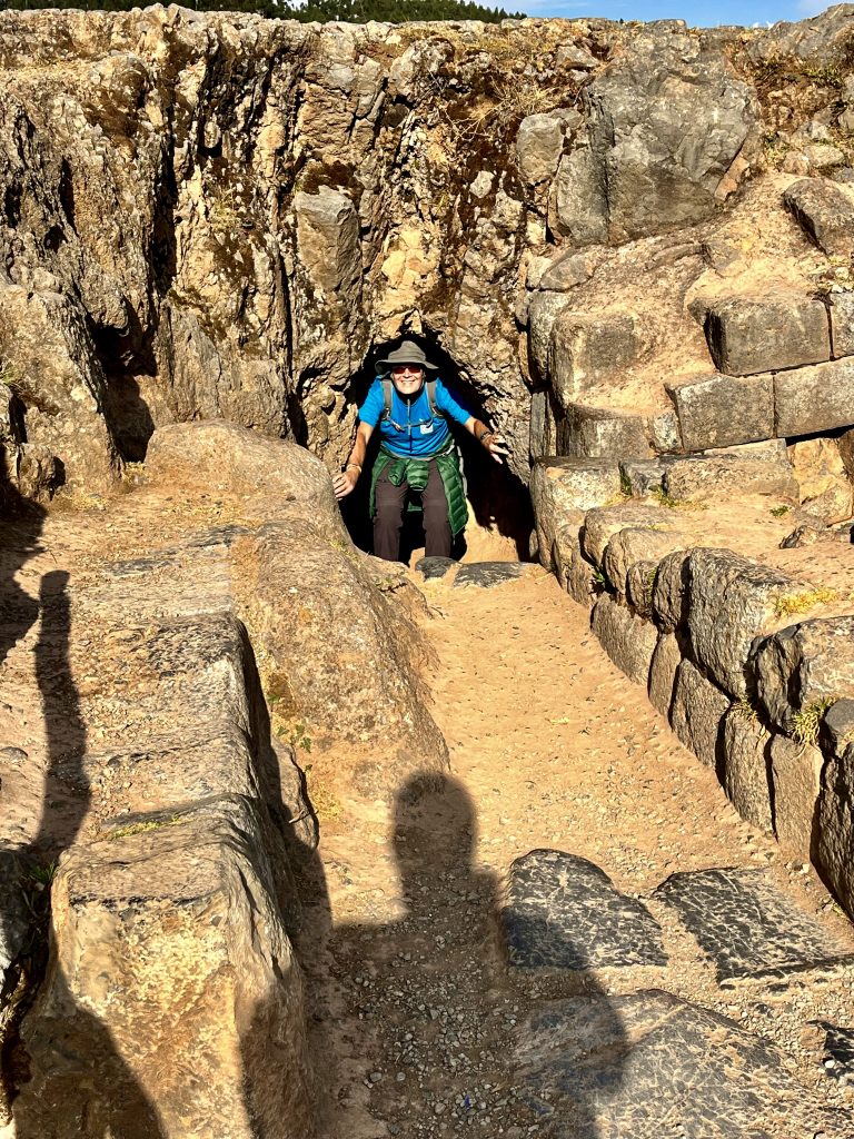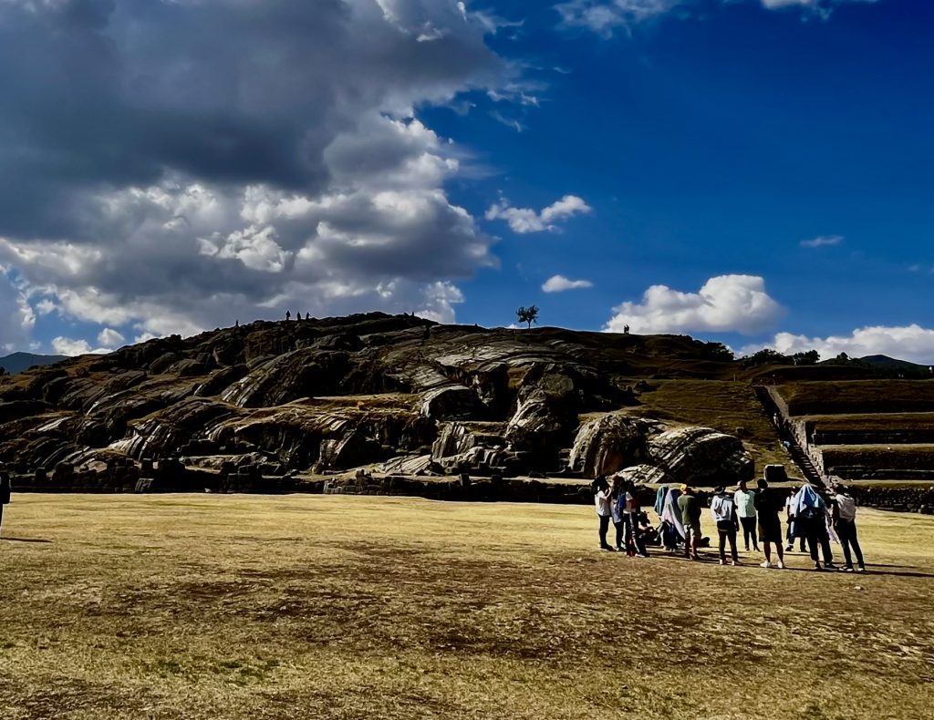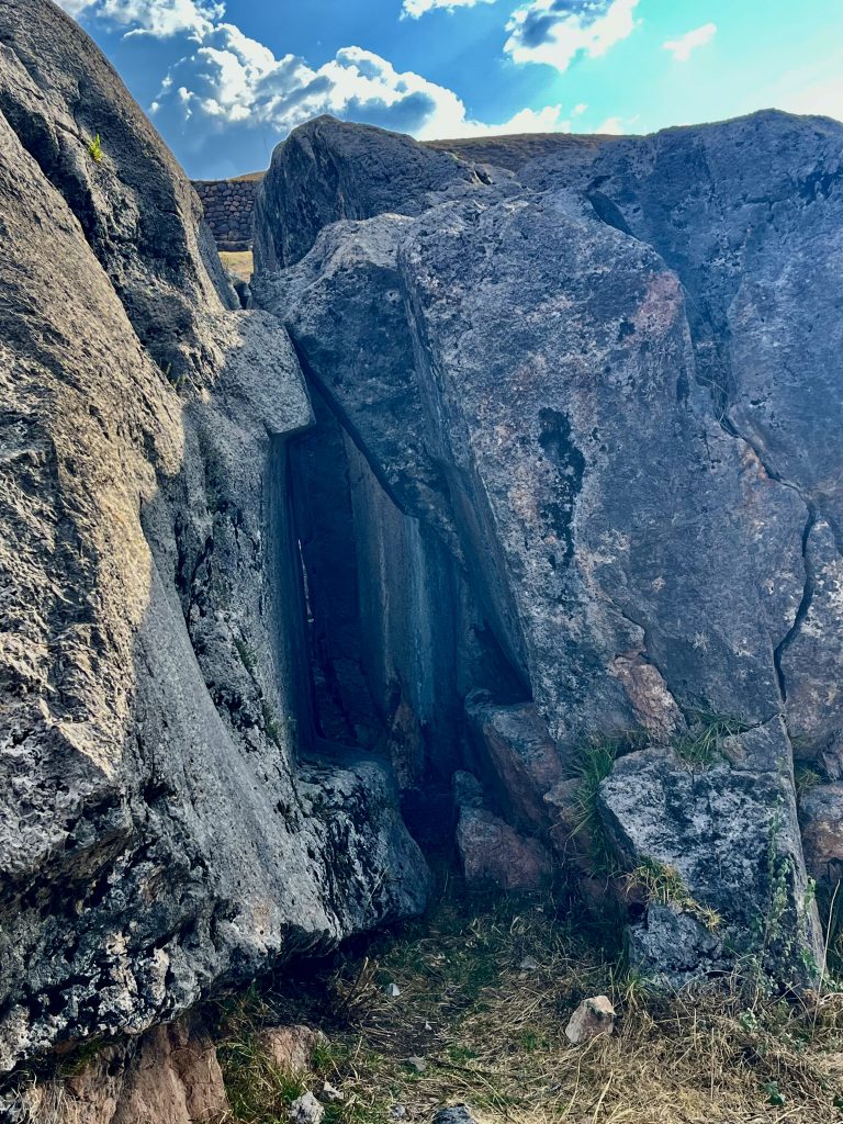 Das ist unser neues Hotel, siehe oben, für die nächsten 2 Nächte. Es ist sehr spanisch angehaucht. Dieser klassisch-spanische Stil könnte auch in Barcelona oder auf Mallorca zu finden sein. Unser Bett ist auf der Maisonette. Noch höher… 😮💨. Also echt jetzt, die fast 3.500 Meter Höhe macht uns wirklich zu schaffen. Unsere Nasen sind immer verstopft, ich habe immer leichte Kopfschmerzen und Schnappatmung, Klaus auch, und dazu habe ich noch endlos zappelige Beine, fürchterlich!!! Wir müssen unsere Körper etwas besser an die Höhe gewöhnen. Also steigen wir noch etwas höher hinauf, zum Haus der Sonne. Sacsayhuamán ist unser Ziel, eine riesige Anlage der Inka, die sowohl religiösen als auch Verteidigungszwecken diente. Sie liegt 3 Kilometer oberhalb von Cusco‘s Stadtzentrum. Wir lassen uns von einem Uber zum Eingang kutschieren, zahlen den Eintritt und steigen über Stufen und Wege hinauf. Langsam, ganz langsam und mit Päuschen. 😅 Stimmt ja gar nicht, stimmt ja gar nicht! Wir machen noch vor dem Eingang unsere erste Pause und spachteln ein leckeres, spätes Mittagessen, in einem sehr stylischen Lokal. 😆