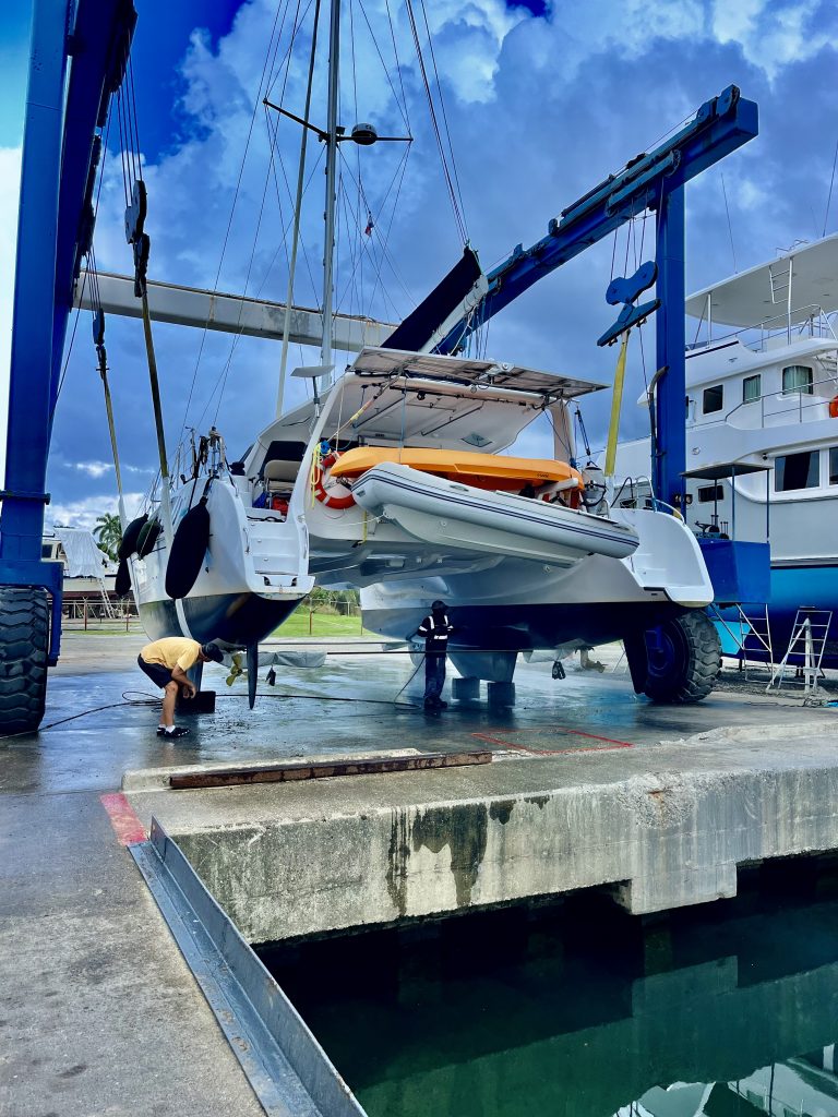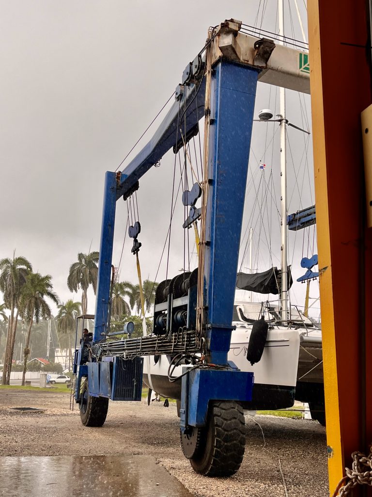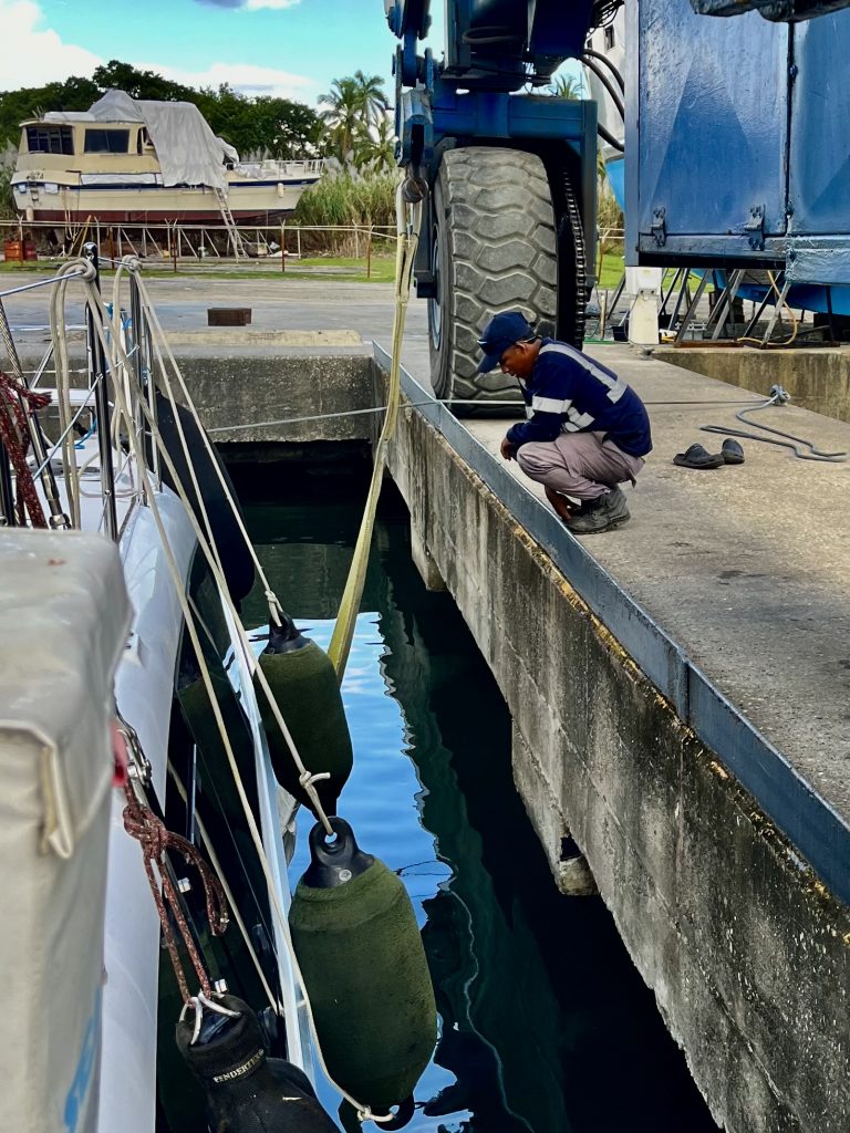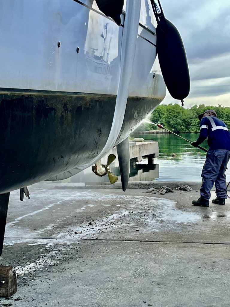 Konzentriert und zuverlässig fährt Victor, der Liftfahrer, das Boot an seinen Trockenplatz. Aber zuvor macht sich ein anderer älterer Mann mit Hochdruckreiniger an den Boatswash. Zwei junge Männer schaben mit Spachteln die Rümpfe ab und entfernen so die Seepocken, zumindest die Häuschen. Das ganze Unterfangen dauert bestimmt eine Stunde und geht gezielt aber vorsichtig vonstatten. Na so einen gründlichen Waschgang haben wir bisher nirgends gesehen.