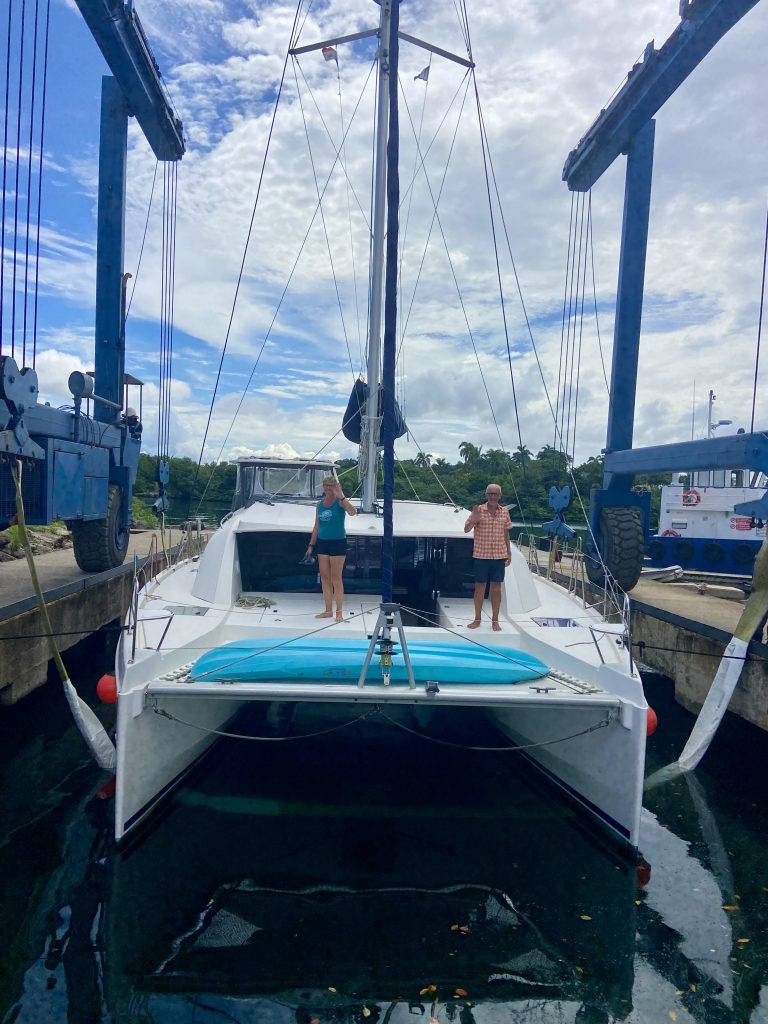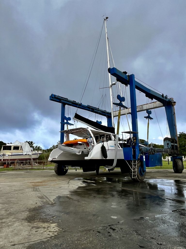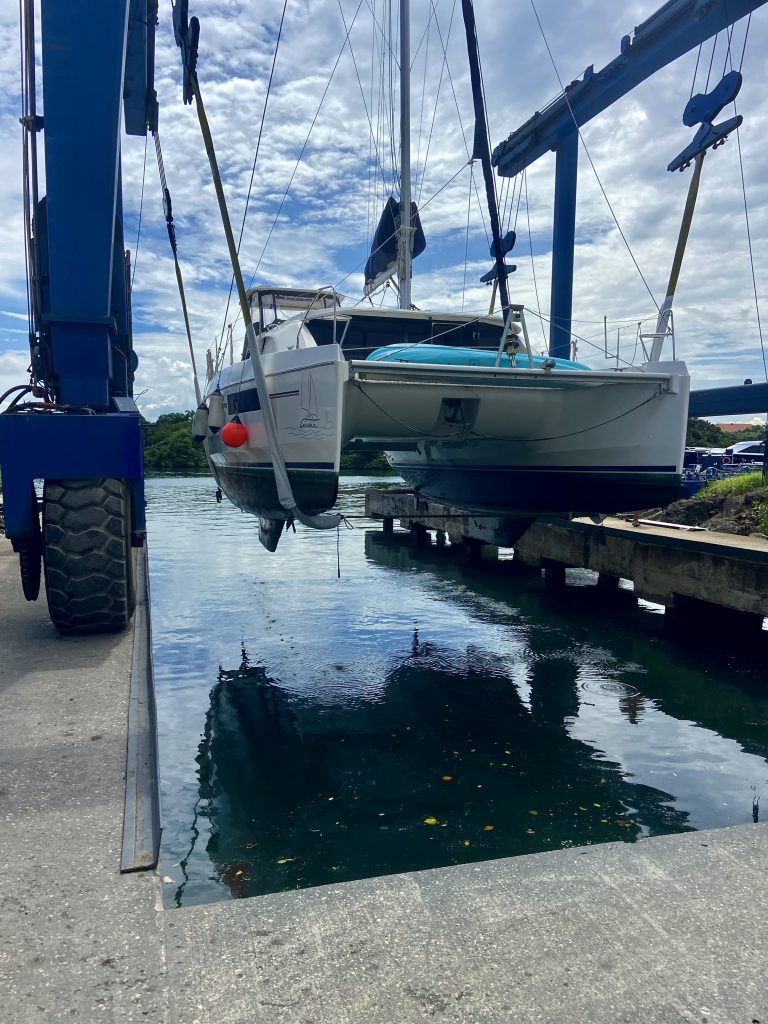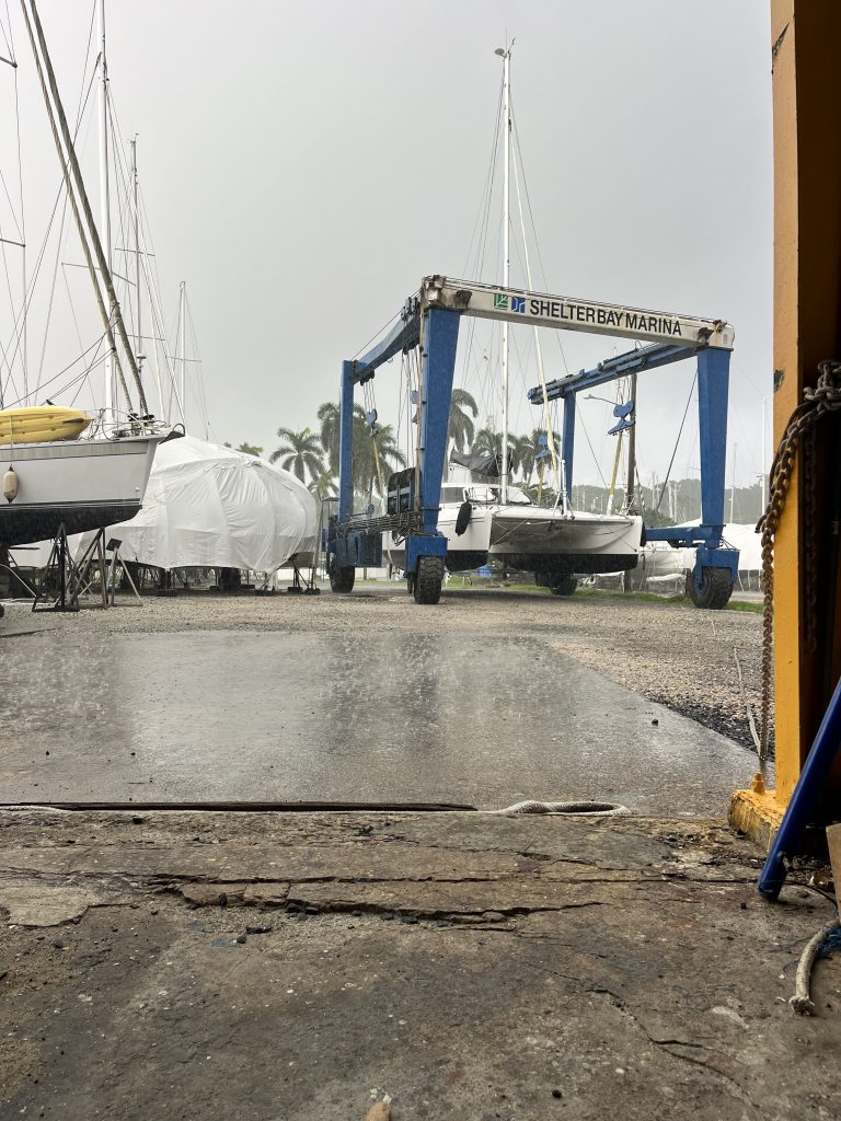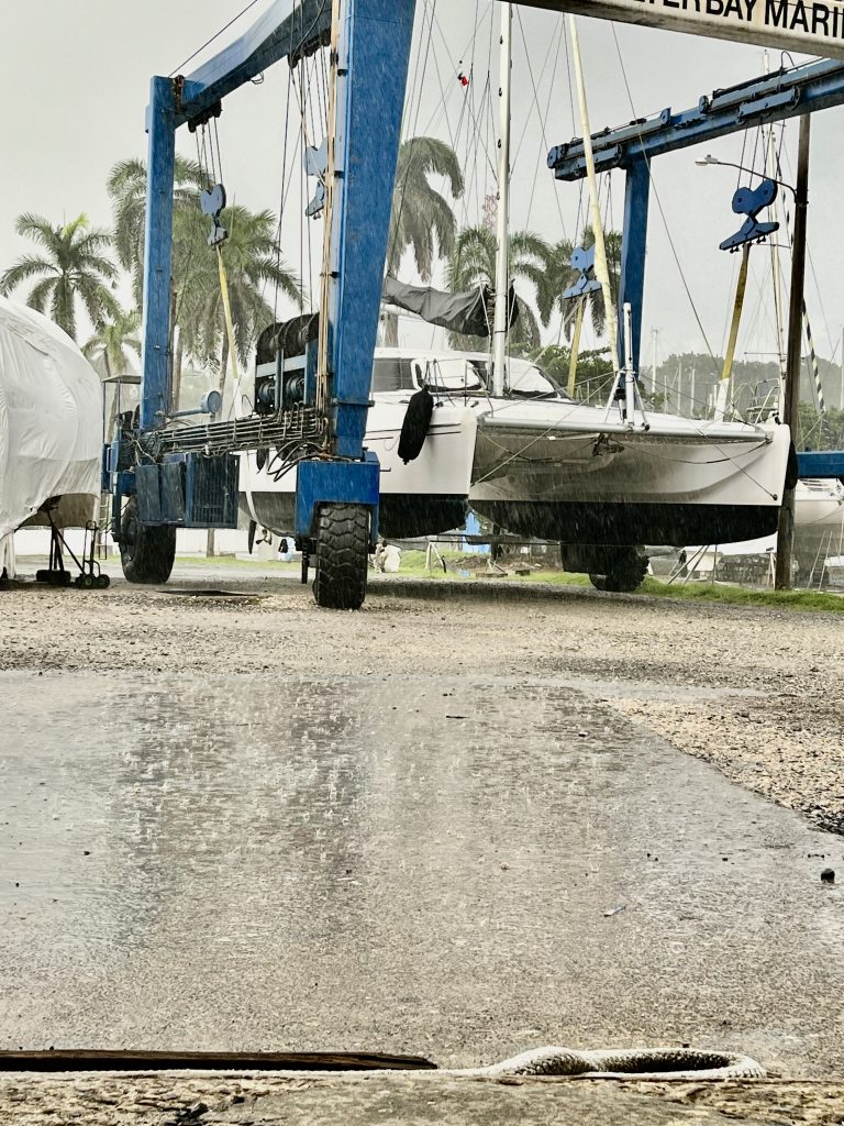 Konzentriert und zuverlässig fährt Victor, der Liftfahrer, das Boot an seinen Trockenplatz. Aber zuvor macht sich ein anderer älterer Mann mit Hochdruckreiniger an den Boatswash. Zwei junge Männer schaben mit Spachteln die Rümpfe ab und entfernen so die Seepocken, zumindest die Häuschen. Das ganze Unterfangen dauert bestimmt eine Stunde und geht gezielt aber vorsichtig vonstatten. Na so einen gründlichen Waschgang haben wir bisher nirgends gesehen.