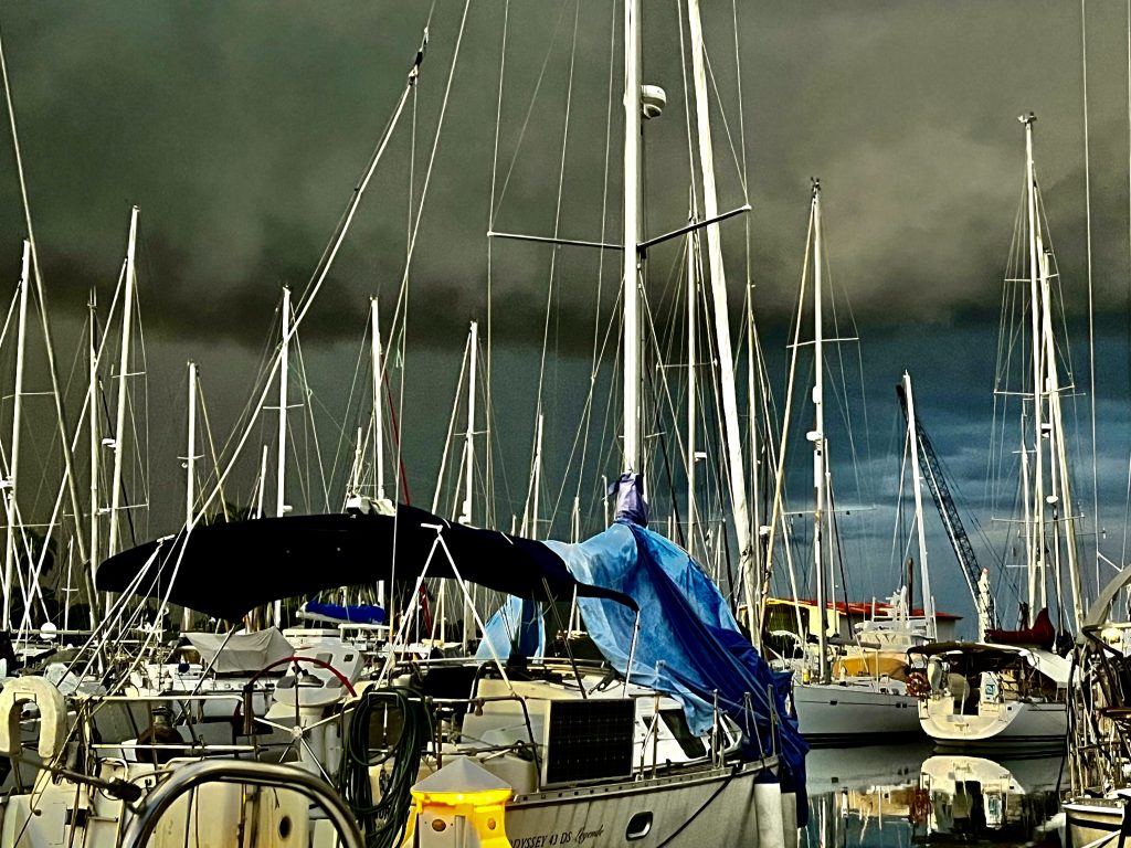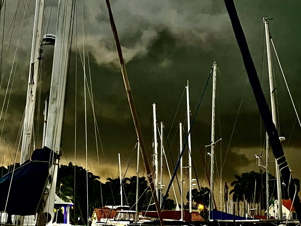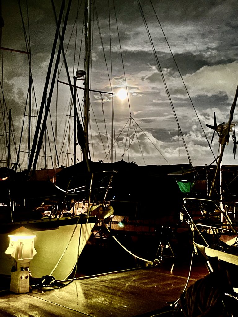 Mindestens einmal am Tag oder/und in der Nacht zieht sich der Himmel so zu. Dann dauert es nicht lange und Blitze zucken, Donner grollen und Regen prasselt auf alles nieder. Die Sorge, ein Blitz könnte uns erwischen ist immer mit dabei. All zu oft erfahren wir von Bootseignern, denen es so ergangen ist. So ist es halt am Äquator. 😬