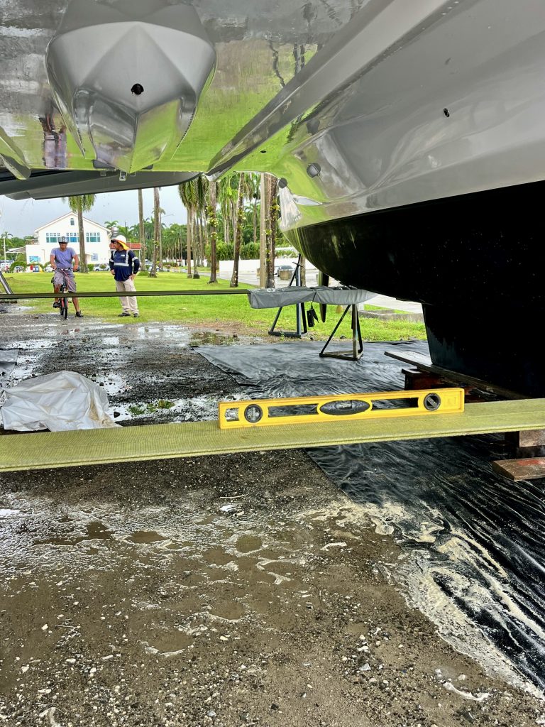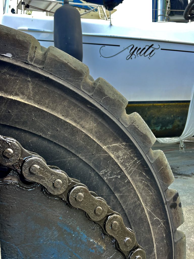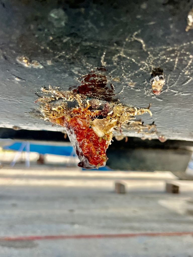 Und siehe da, da sind sie auch schon ab. Über eine Stunde wird mit viel Geduld und Gefühl geschabt und gespritzt. Eigentlich sieht es jetzt schon so gut aus, dass wir fast sofort wieder rein könnten. Aber nee, es sind ja noch ein paar andere Dinge zu erledigen, und die „Bodenplatten“ der Seepocken sind ja auch noch da. Also wird Yuti auf ihren vorgesehenen Platz gefahren.