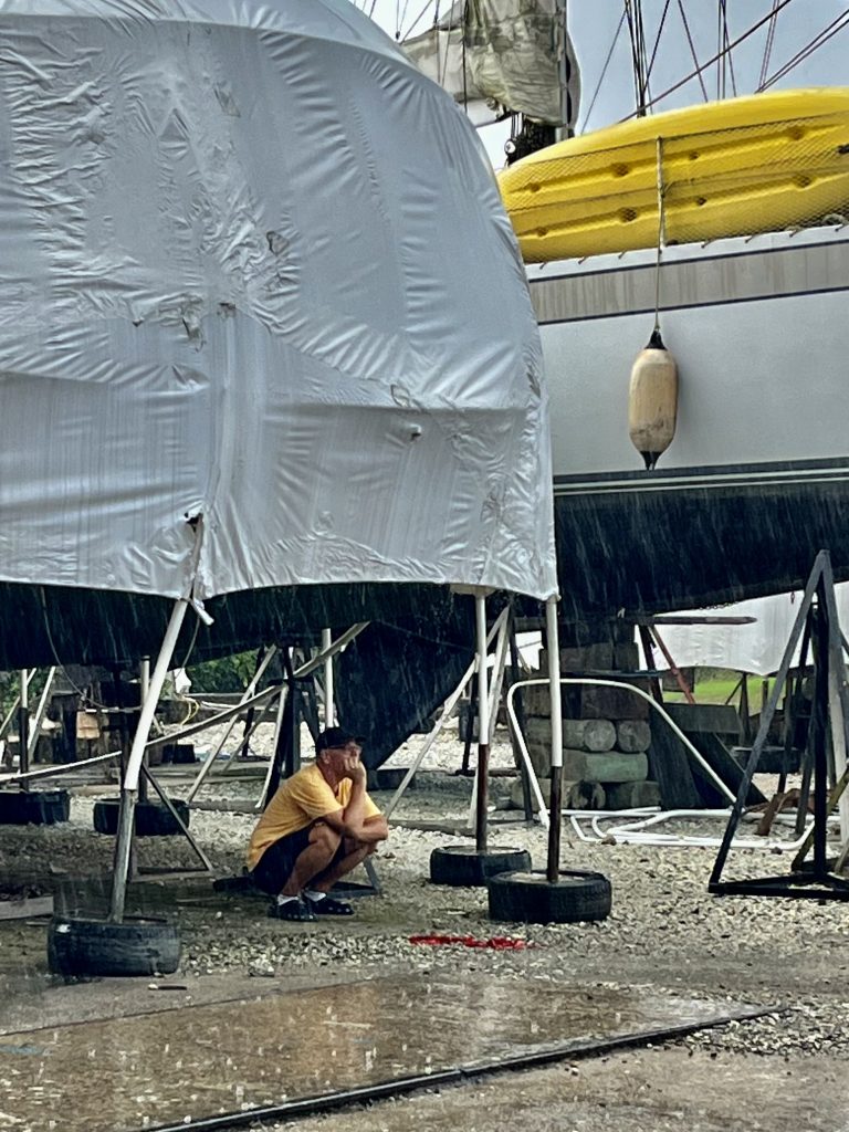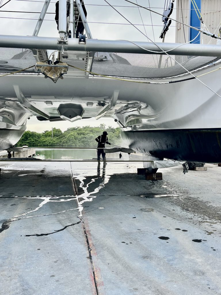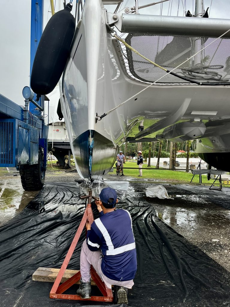 Yuti steht sicher und fest, der Travel Lift ist weg, und wir legen dann auch gleich mal los. Erstmal kratzen wir ein paar Pockenplättchen weg. Jepp, das geht ganz gut. Dann lassen wir diese Arbeit aber schnell liegen und widmen uns dem Reinigen und Polieren der Hulls. Mit dem Bootsreiniger noch von Toy aus Phuket, beginnen wir mit dem Waschen der äußeren und inneren Seiten. In dem Waschmittel ist kein Wachs, denn wir wollen Seitenstreifen kurz über der Wasserlinie anbringen. Viele Boote haben solche Zierstreifen, um die immer schmuddelige Wasserlinie etwas zu kaschieren. Wir beeilen uns, denn wieder ziehen dunkle Wolken auf.