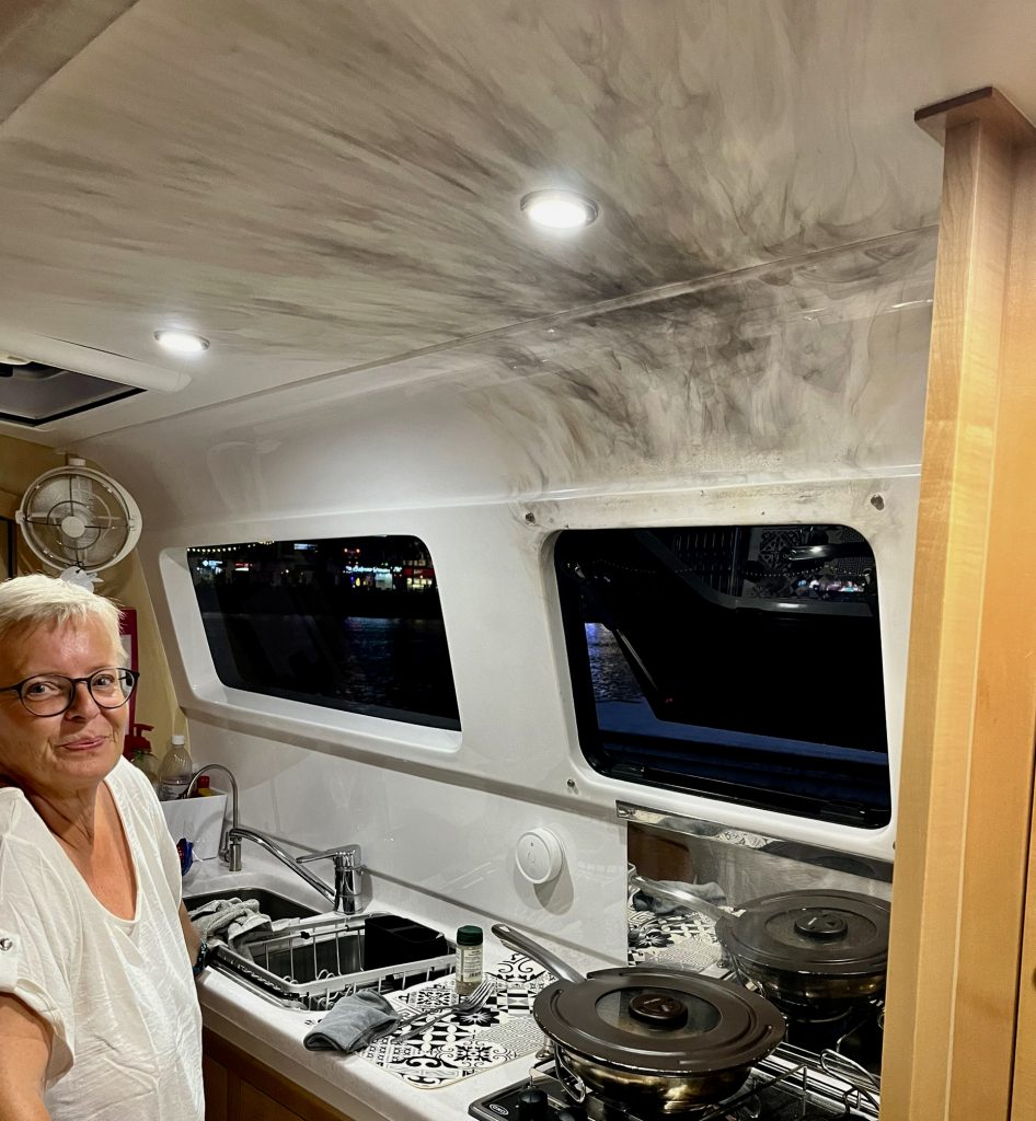 Es gibt eine wirklich große Stichflamme, das Fliegengitter brennt, die Jungs von der Motoryacht gegenüber kommen schon mit dem Schlauch gerannt, aber glücklicherweise erstickt sich der Fliegengitterbrand von selbst. 😮💨 Tja, das Fliegengitter ist hin und die Front und Decke von Rußspuren gezeichnet. Mir ist zum Glück nichts passiert. Aber WAS ist da denn gerade passiert? Waren Fettspritzer der Grund? Das muss ich später noch genauer untersuchen. Erstmal brate ich das Fleisch zu Ende, dann startet die große Putzaktion. Mit Priel, Zauberschwamm und Gelcoat-Politur rücken Klaus und ich gemeinsam den Rußspuren zu Leibe. Ja, es sieht wieder ganz manierlich aus. Morgen bei Helligkeit werden wir nochmal kritisch gucken und bestimmt noch ein paar Mal drüber putzen müssen. Später schaue ich mir die drei Gasplatten nochmal genauer an, und komme zu dem Schluss, es war der ungeputzte Schornsteineffekt. Als ich die losen Teile der Platten hochnehme, sehe ich Ruß und Schlacken, eben wie bei einem ungeputzten Kamin/Schornstein. Die müssen sich entzündet und zu der Stichflamme 🔥 geführt haben. Auch konnte ich die Gasflammen gar nicht mehr richtig klein drehen. Nach der Beseitigung der Schlacken funktioniert wieder alles wie gehabt. Wieder was gelernt❗️ Habe ich doch früher nie mit Gas gekocht oder gebraten.