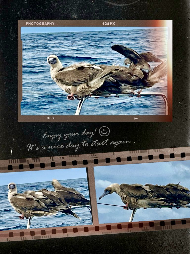 Um 6:00 und 7:00 Uhr sind unsere Müttergespräche an der Reihe, und ein Sturmvogelpaar hat auf unserer Reling Platz genommen und die Nacht verbracht und ordentlich gekackt.