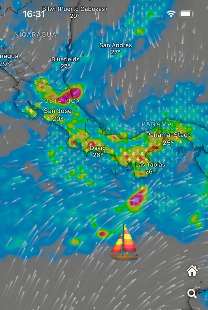 In den frühen Morgenstunden, die Zeit, in der ich versuche zu schlafen, macht Klaus mehrere Wenden, um wieder weiter in den Westen zu kommen. Die Böen sind mit bis zu 25 Knoten kräftig. Yuti kracht unzählige Male richtig hart in die Wellen rein. Die Schläge hauen mich aus meiner Koje. Ich liege ja recht weit vorne mit meinem Bett im Rumpf, und da sind sowohl die Schläge als auch der Lärm besonders schlimm. Ich könnte auch im Salon nächtigen, aber meine Seite vom Sofa ist schmal und etwas abschüssig. Auf Dauer bekomme ich da Rücken und Nacken und eingeschlafene Arme und … Geht also nicht wirklich. 🫤 Nun gehe ich aber hoch in den Salon. Es schüttet wie aus Eimern und das Segeln ist unangenehm! Die tropische Konvergenzzone lässt grüßen.