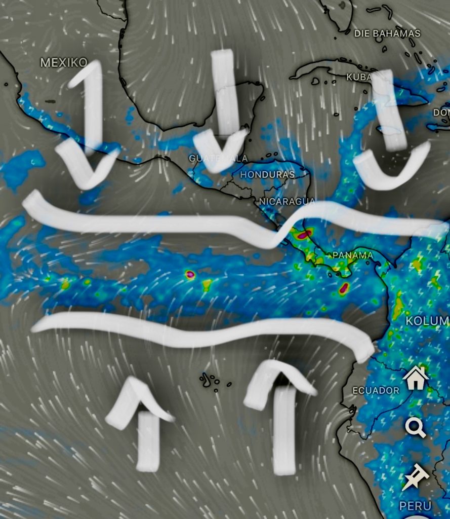 Hierbei kommen die Winde aus entgegengesetzten Richtungen, treffen aufeinander und schießen nach oben. Dabei kommt es zu heftigen Turbulenzen, mit Blitz, Knall und Bum sowie kräftigem Regen. Diese wabernde Zone bestimmt ganz vehement auch das Wetter über Panama. Darum gehen in regelmäßiger Kontinuität massive Gewitter auch über der Shelter Bay nieder. Wir haben viele von ihnen erlebt und immer ein bisschen befürchtet, ein Blitz könne einschlagen. Diese Gefahr besteht hier auf dem offenen Wasser natürlich erst recht. Aber zum Glück macht hier nur der Regen runter, kein Blitz zuckt, kein Donner grollt. Dann hört es auch auf zu schütten und wir segeln mutterseelenallein in die Weiten des Pazifiks. Weit und breit ist kein anderes Boot zu entdecken. Nur auf dem Plotter ist ein Fischtrawler zu sehen. Und, wie könnte es anders sein, hält der genau auf uns zu. Den müssen wir wohl im Auge behalten. Dann haben wir ihn aber auch schon hinter uns zurückgelassen.