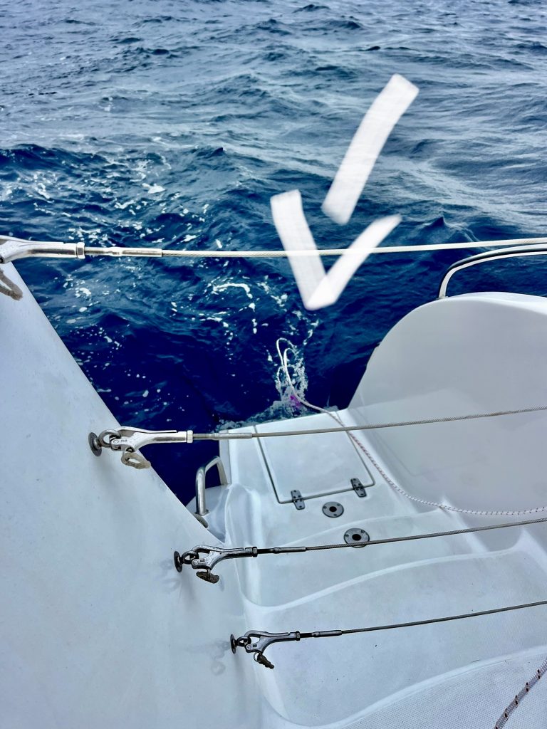 Oh Scheiße❗️ Die hat sich wohl mit dem Ruder und/oder Propeller verwurschtelt. Shit, shit, shit… Wie ist das nur möglich? Klaus fuhr in der Nacht 2, 3 Manöver und dabei muss es passiert sein. An die Angelschnur hatte er gar nicht mehr gedacht. Was nun❓Da muss wohl einer von uns beiden ins Wasser. 🫢 Ich? Nein du! Sollen wir Streichhölzer ziehen? Nein. Klaus erbarmt sich, er wird in die ruppige Salzsuppe steigen. Doch zuvor müssen wir reffen! Nein, nicht nur reffen. Die gesamte Besegelung muss runter, damit Yuti möglichst wenig Fahrt hat. Dann müssen Flossen und Brille aus der Segelluke vorne geholt werden, das mach dann mal ich. Das Runterholen der Segel hat geklappt,…