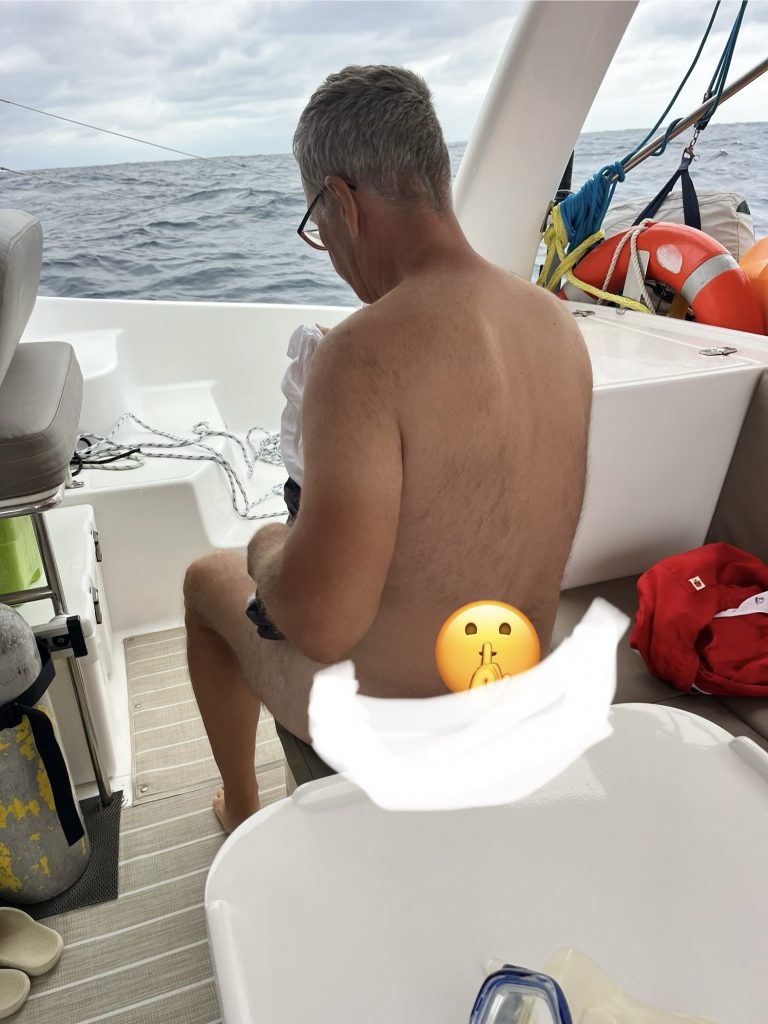 Mensch, da ist Klaus aber erleichtert!!! Jetzt muss er nicht ins Wasser, was ein Glück❣️ Durch das Anhalten des Bootes und die gegen uns laufende Strömung, muss sich die Leine wieder befreit haben. Toll❣️ Nun müssen wir Yuti aber schleunigst wieder auf Kurs bringen. Die Motoren laufen sowieso schon, also ab in den Wind, das Groß wieder rauf, ganz rauf, sowie das Jib raus. Ja, wir haben ein sichtbares Stück an Höhe verloren und kämpfen uns wieder zurück. Jetzt haben wir HUNGER! Toasts müssen für‘s erste reichen. 🥪🥪 Wir sind nun den sechsten Tag auf See und schon ganz schön abgerissen, Yuti, Klaus und ich. Alles ist wieder mit einer schmierigen Salzschicht überzogen, garniert mit etwas Mayonnaise. Wir sind ungewaschen, Klaus hat Bartstoppeln, meine Kleidung ist besudelt und die Haare zerzaust. Jepp, wie sagte ich schon des Öfteren? Man wird auf so einer Reise nicht schöner!!! Blaue Flecken vom Umherstolpern zieren die Haut, geklemmte Finger schmerzen oder verdrehte Knie, abgesplitterte Fingernägel, müde rotgeäderte Augen und klebrige Haut sind nur einige der unschönen Begleiterscheinungen. Hoffentlich wird es dann doch irgendwann ruhiger, dass man sich und das Boot wieder etwas auf Vordermann bringen kann.