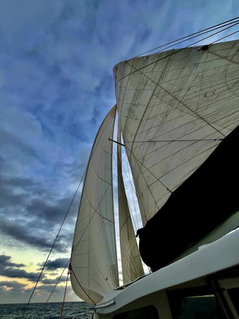 Eine große Delphinschule zieht an uns vorbei. Da wir nicht schnell genug sind, ziehen die Tiere flott weiter, ohne mit Yuti zu spielen. Doch schön ist es, sie pusten zu hören und springen zu sehen❣️Die Sonne geht hinter den Wolken schlafen, meine Nachtwache steht an, Klaus legt sich auf die Seite. Die Besegelung sieht wie folgt aus. Volles Groß und Screecher. Jepp, kurzzeitig hatten wir sogar noch das Jib mit dabei, also alles was geht.
