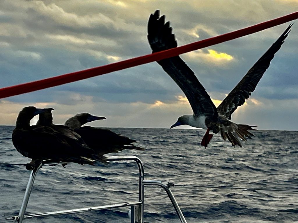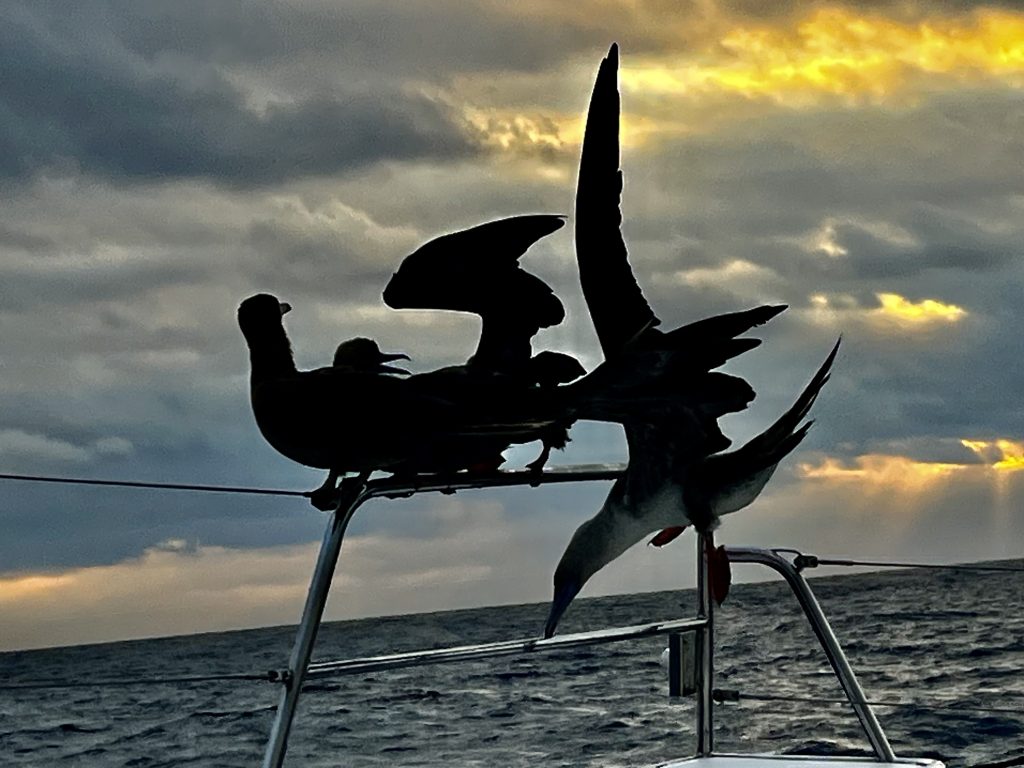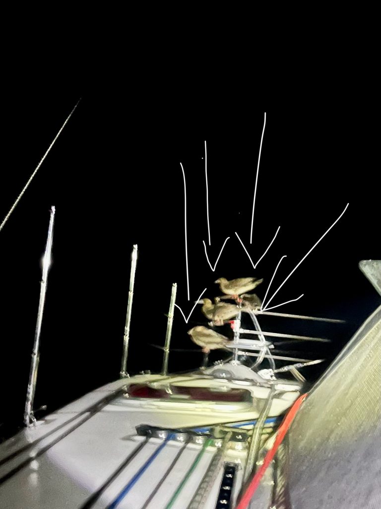 Drei Stunden später, wir sind noch immer nicht weit genug, aber schon im Randbereich. Meine Nachtwache läuft, das Wellenbild ist unruhig, aber Vorkommnisse gibt es keine. Sieben Seevögel haben es sich bei uns „bequem“ gemacht. Sogar auf der rechten, unbeliebten Seite sitzen drei.