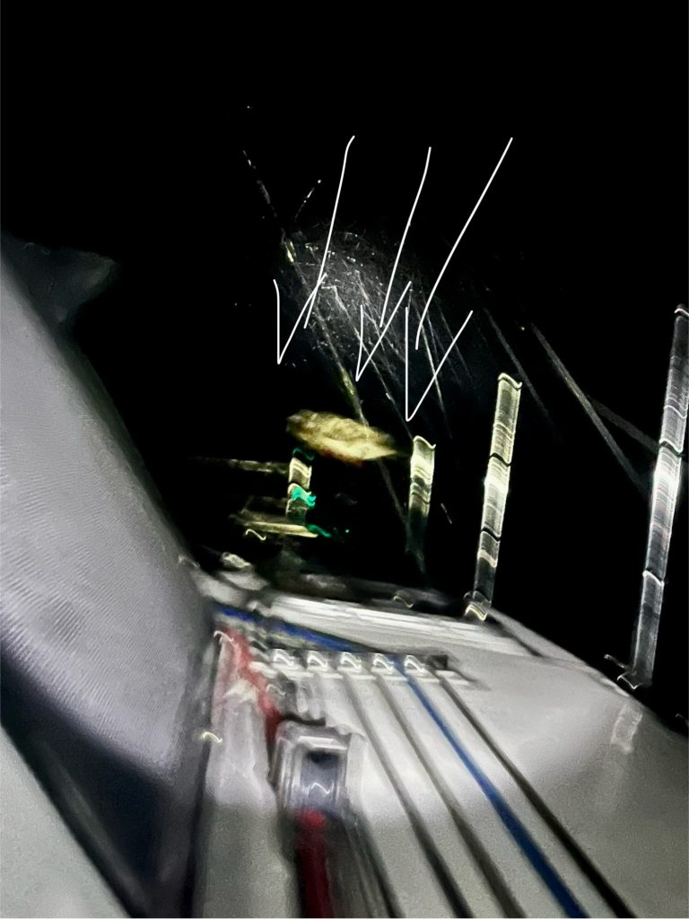 Um Mitternacht haben wir schon 1,9 bis 2 Knoten Strömung. Wir fliegen mit 8 Knoten dahin. Jippie 🥳!