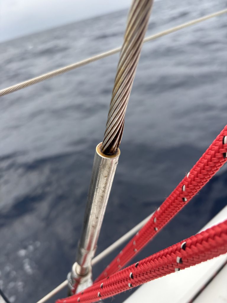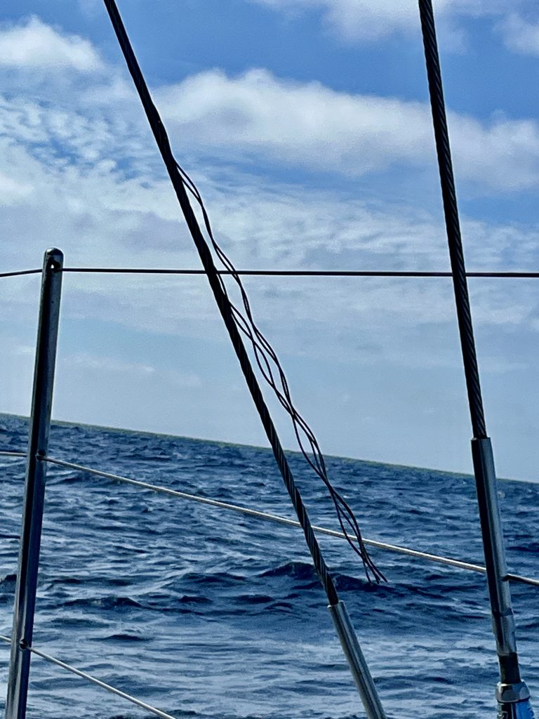 Wow, das sieht nicht gut aus! Bei genauem Hinsehen sind von 19 Drähten 6 gerissen, gebrochen und kaputt, 4 davon staksen heraus. Schnell ein Blick auf die andere Seite. Auch da sind 2 Drähte gerissen, die anderen schon leicht gewölbt. Damit ist uns sofort klar, der Mast ist nicht mehr stabil. Bricht auch nur eine Want komplett, macht der Mast mit allem drum und dran beim nächsten Wellenschlag den Abgang, mit Folgen, die wir dann nicht mehr übersehen oder gar beherrschen können.