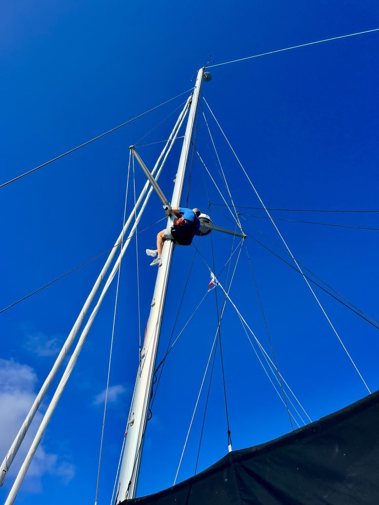 Sprachlos schauen wir uns an. Was tun wir jetzt? Wir müssen für zusätzliche Stabilität sorgen. Okay. Zwei stabile Leinen werden vorbereitet. Groß und Jib müssen runter und eingerollt werden. Klaus macht sich fertig, steigt in den Bootsmannstuhl, ich ziehe ihn hoch in den Mast. Da es sich um die kleinen Wanten handelt, die die Mitte des Mastes halten, muss Klaus zum Glück nicht ganz bis nach oben.