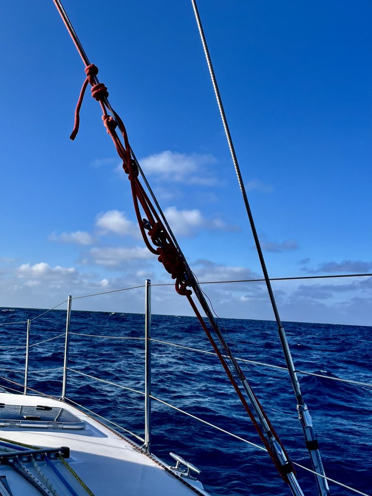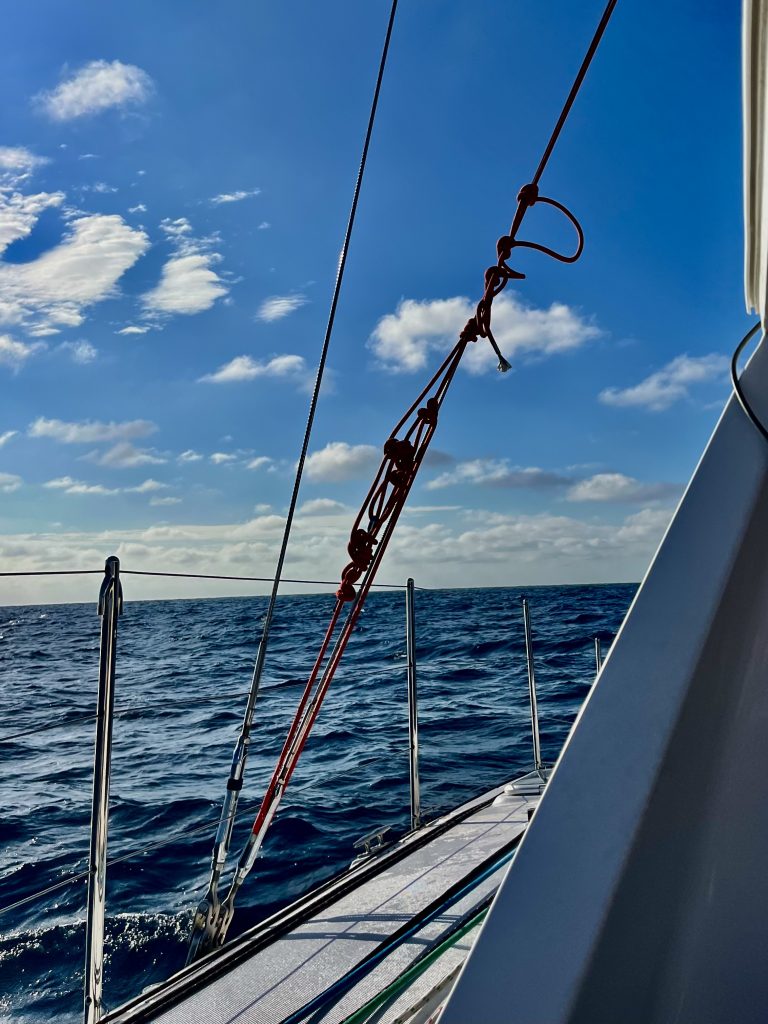 9:00 Uhr, der Tacho wird mal wieder befragt. Er steht nun bei 16.551 NM und 168 Seemeilen wurden somit vertilgt 😋. Neuer Rekord! 2.500 NM werden wir jetzt immer geradeaus gen Westen segeln, bis wir die letzten 500/600 NM südlich auf die Marquesas zuhalten. So der Plan. Jetzt muss nur noch der Wind drehen und von hinten blasen, dann könnte es richtig nett werden. Doch von vorne kommt er schon gar nicht mehr, er bläst jetzt seitlich in die Segel. In der Fachsprache heißt das „halber Wind“. Das ist gar nicht übel, so müssen wir nicht mehr hart am Wind segeln und gegen die Wellen bolzen.