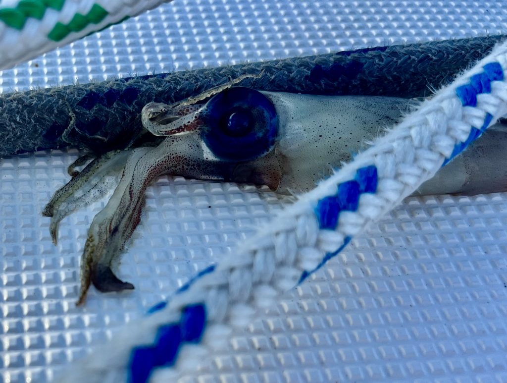 Unzählige Tintenfische liegen festgeklebt an Deck und stinken vor sich hin. Die Seevögel interessieren sich nicht die Bohne für sie und lassen sie einfach links liegen. Dann muss ich die mal absammeln und über Bord schmeißen.