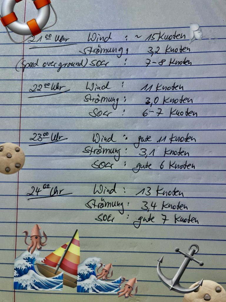 Meine Nachtwache beginnt, es regnet ganz leicht und ich schreibe die nächsten Stunden mal auf, wie sich Wind, Strömung und Geschwindigkeit durchs Wasser so entwickeln. Beschäftigungstherapie. ✍️