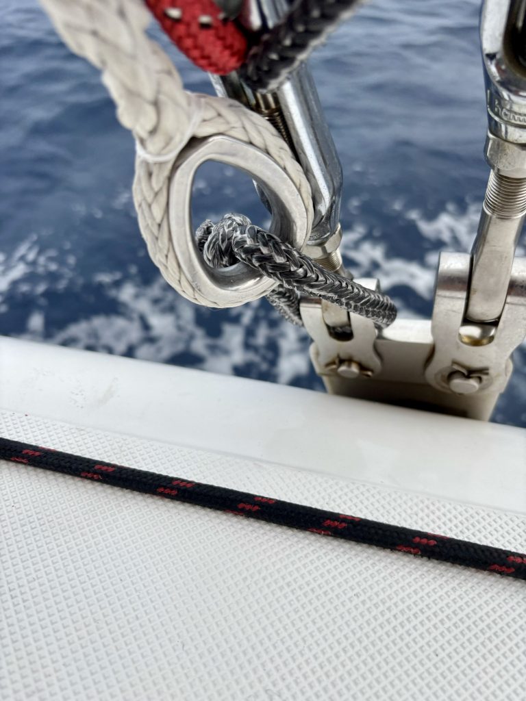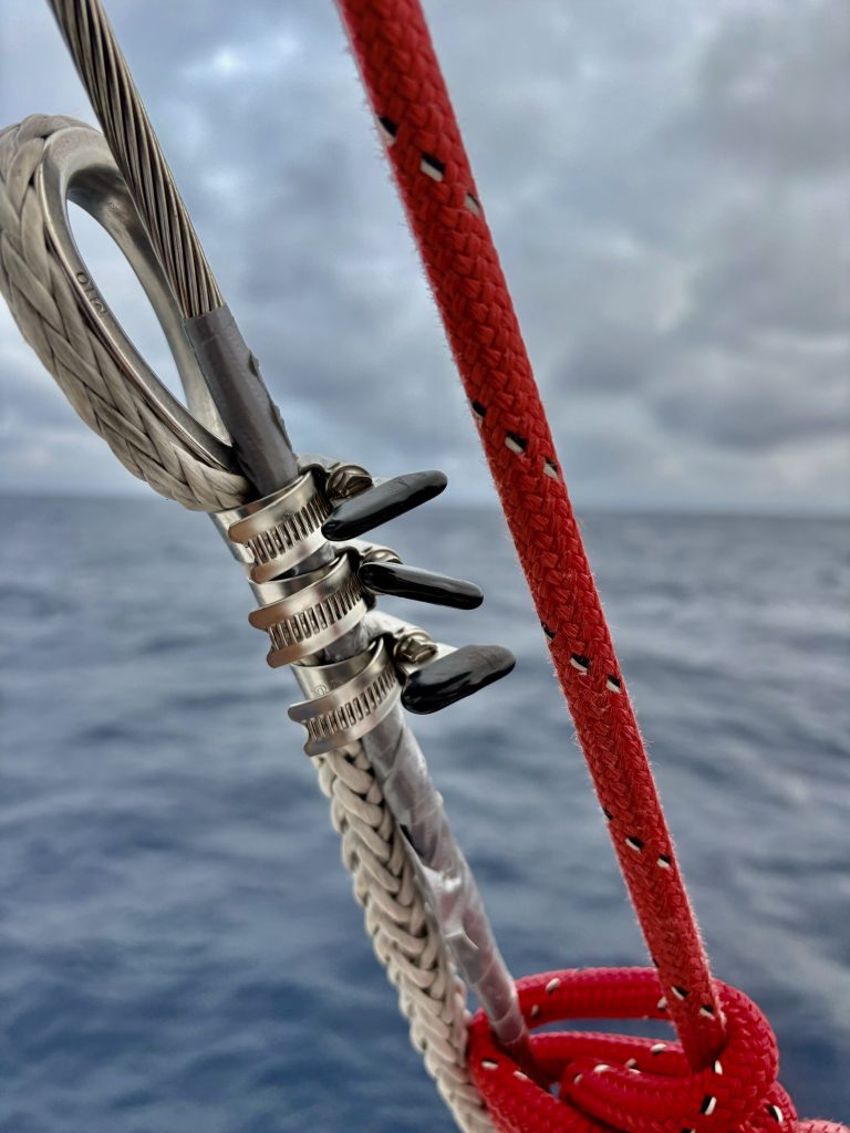 Für schlimme Stürme ist sie gedacht, um das Boot bei zu hohen Wellen nicht absausen und in den nächsten Wellenberg knallen zu lassen. Von Seawind bekamen wir noch zusätzliche, super starke Verbindungsleinen, für die Befestigung zwischen Drogue und Boot, dazu. Davon wird er jetzt eine nehmen und sie direkt mit mehreren starken Schellen an der Want und mit einem weiteren Softschäkel an der Stahlverbindung der Want befestigen. Im Wissen, dass die Schellen das schwächste Glied dieser Kette sind, aber in der Hoffnung, dass bei Abriss diese Konstruktion dennoch hält, macht er sich ans Werk.