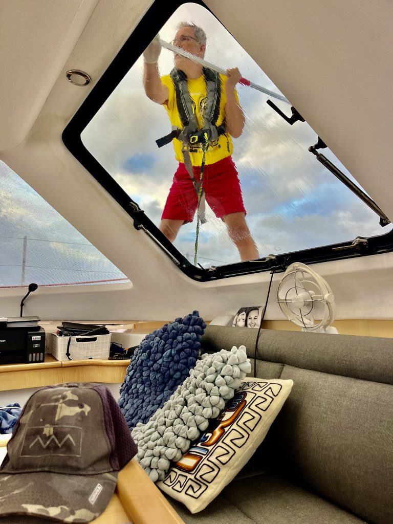 Jetzt putzt Klaus noch so gut es geht das Deck mit Salzwasser.