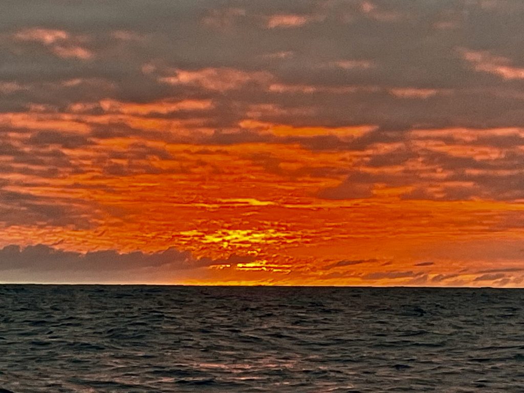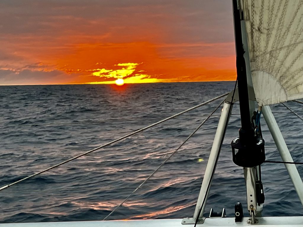 20:00 Uhr, wir holen das restliche Großsegel herunter und machen den Segelsack zu. Warum? Wir sind zu schnell. Der Wind wird die nächsten Stunden und Tage zunehmen, die Strömung drückt unverändert stark. Wir wollen nicht vor Sonntag an dem Punkt der notwendigen Kursänderung nach Süden sein. Es ist schon ein Ritt auf der Rasierklinge für uns. Nerven bewahren! Wir wollten langsamer werden, werden wir aber nicht. Nur mit unserem kleinen Jib fahren wir immer noch 5 Knoten, sogar 6 Knoten. Der Wind nimmt jetzt schon deutlich zu und bläst mit bis zu 18 Knoten in unser kleines Jib. Und es wird schlimmer! Die Nacht wird sehr unruhig!🌊🌊🌊🌊🌊🌊🌊🌊⛵️🌊🌊🌊🌊🌊
